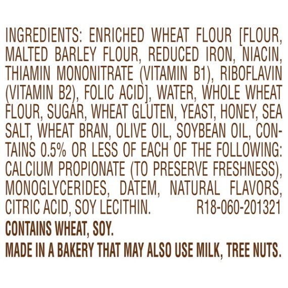 Details Ingredients Enriched Wheat Flour [Flour, Malted Barley Flour, Reduced Iron, Niacin, Thiamin Mononitrate (Vitamin B1), Riboflavin (Vitamin B2), Folic Acid], Water, Whole Wheat Flour, Sugar, Wheat Gluten, Yeast, Honey, Sea Salt, Wheat Bran, Olive Oil, Soybean Oil, Contains 0.5% Or Less Of Each Of The Following: Calcium Propionate (To Preserve Freshness), Monoglycerides, Datem, Natural Flavors, Citric Acid, Soy Lecithin. Show more Product features Introducing the NEWEST addition to the Sara Lee Artesano Bread family, ArtesanoGolden Wheat. Made with a touch of honey, olive oil & sea salt, ArtesanoGolden Wheat transforms the routine into the remarkable. Artisan-style bread with thick slices and a dash of flour dusting Made with a touch of honey, olive oil and sea salt Elevates your everyday meals into something remarkable for the whole family Great for grilled cheese, french toast, garlic bread, deli sandwiches, a BLT and more! No high fructose corn syrup OR artificial colors or flavors Net Quantity of Content 15.0 X 1 slice