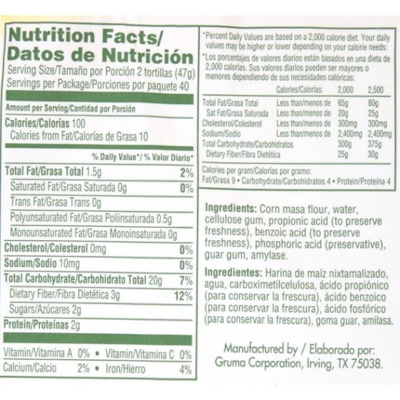 Details Ingredients CORN MASA FLOUR, WATER, CELLULOSE GUM, PROPIONIC ACID (TO PRESERVE FRESHNESS), BENZOIC ACID (TO PRESERVE FRESHNESS), PHOSPHORIC ACID (PRESERVATIVE), GUAR GUM, AMYLASE. Show more Product features We use high quality ingredients and time-tested techniques to make sure every package of Guerrero White Corn Tortillas are an authentic addition to your family's dinner table. Our tortillas have a soft texture and traditional flavor that enhances any recipe, from Mexican dishes passed down through the generations to any modern twist you can come up with. Guerrero White Corn Tortillas are also gluten free and don't contain any lard, trans fat, or cholesterol. We recommend loading our corn tortillas with homemade carne guisada topped with avocado and cotija cheese. Includes one 80 ct package of Guerrero White Corn Tortillas. One 80 count package of Guerrero White Corn Tortillas Authentic taste and soft texture Gluten free 0g of trans fat per serving No cholesterol or lard Special Features No cholesterol Net Quantity of Content 40 X 47 g