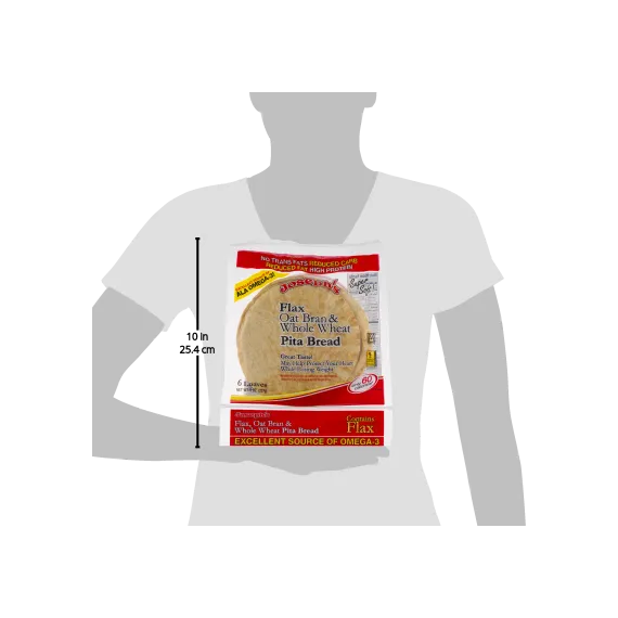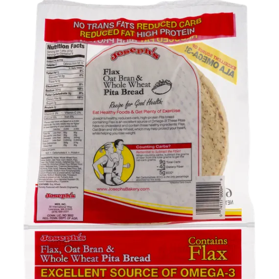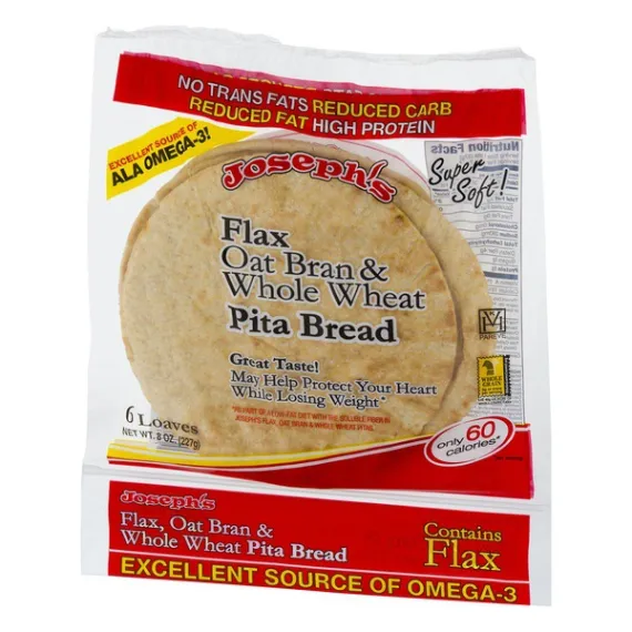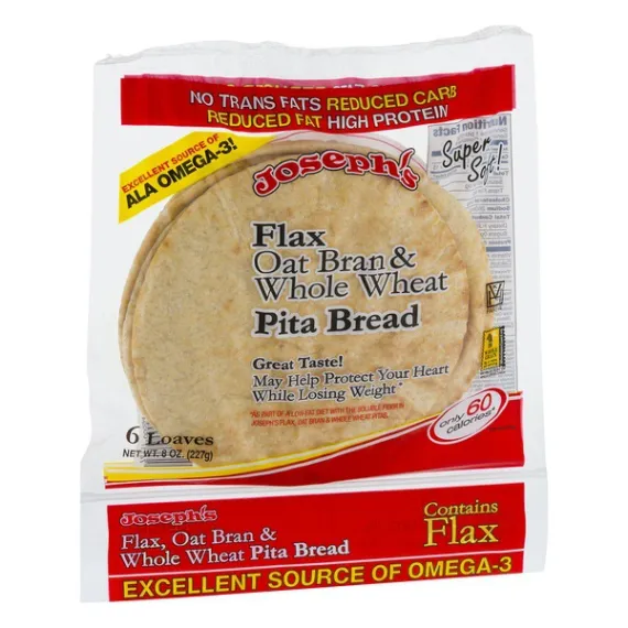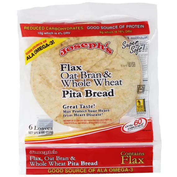 Details Ingredients WATER, WHOLE WHEAT FLOUR, WHEAT GLUTEN, OAT FIBER, CORN STARCH, FLAX, YEAST, SOY PROTEIN ISOLATE, DEFATTED SOY FLOUR, SOYBEAN OIL, ENRICHED WHEAT FLOUR (WHEAT FLOUR, NIACIN, REDUCED IRON, THIAMINE MONONITRATE, RIBOFLAVIN, FOLIC ACID), SESAME SEED FLOUR, SALT, CALCIUM SULFATE, SODIUM ACID PYROPHOSPHATE, CALCIUM PROPIONATE (A PRESERVATIVE), OAT BRAN, DEXTROSE, SODIUM BICARBONATE, POTASSIUM SORBATE (A PRESERVATIVE), FUMARIC ACID, MONOGLYCERIDES, HYDROGENATED SOYBEAN OIL, SODIUM METABISULFITE, L-CYSTEINE. Show more Product features Create a healthy and delicious snack or meal with Joseph's Flax, Oat Bran and Whole Wheat Flour Pita Bread. It's ideal for someone that's looking to change their diet and eat healthier. This Joseph's bread can be used to make various dishes and quick treats. It doesn't contain any trans fat or cholesterol. This bread is high in protein and low in carbs. Joseph's Flax, Oat Bran and Whole Wheat Flour Pita Bread, 6-Count: No trans fat Joseph's pita bread is cholesterol-free Reduced-carb High in protein Super soft pita bread 4g fiber 60 calories per serving A good source for omega-3 Contains flax, oat bran and whole wheat Ideal for someone that is trying to eat healthier Delicious taste that's ideal for toasting and baking Enjoy as bread for a sandwich or with hummus Special Features Flax, oat bran And whole wheat flour Net Quantity of Content 6 X 37 g