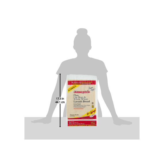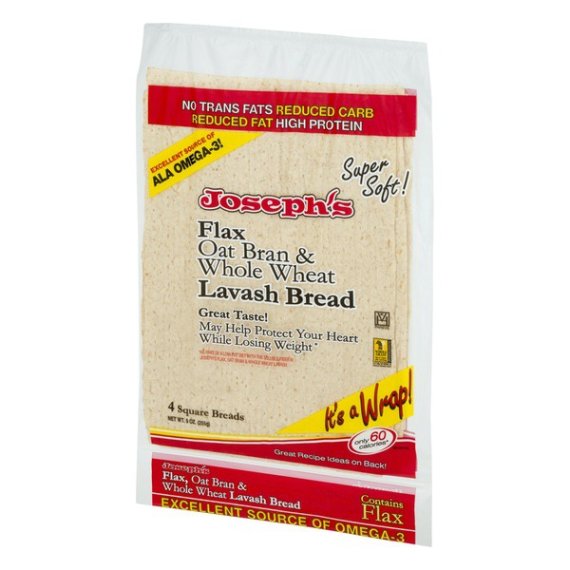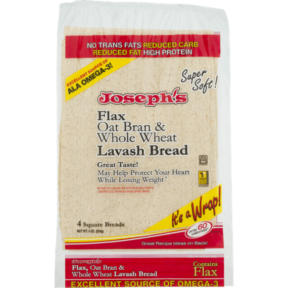 Details Ingredients WATER, WHOLE WHEAT FLOUR, WHEAT GLUTEN, OAT FIBER, CORN STARCH, FLAX, SOY PROTEIN ISOLATE, DEFATTED SOY FLOUR, SOYBEAN OIL, ENRICHED WHEAT FLOUR (WHEAT FLOUR, NIACIN, REDUCED IRON, THIAMINE MONONITRATE, RIBOFLAVIN, FOLIC ACID), SESAME SEED FLOUR, SALT, CALCIUM SULFATE, SODIUM ACID PYROPHOSPHATE, OAT BRAN, CALCIUM PROPIONATE (PRESERVATIVE), YEAST, DEXTROSE, SODIUM BICARBONATE, POTASSIUM SORBATE (PRESERVATIVE), FUMARIC ACID (PALM OIL), ASCORBIC ACID, MONOGLYCERIDES, SODIUM METABISULFITE, ENZYME, L-CYSTEINE. Show more Product features Lavash Bread, Flax, Oat Bran & Whole Wheat Flour 4 squares [9 oz (255 g)] 4 Square breads. Excellent source of ALA omega-3! Super soft! Great taste. May help protect your heart while loosing weight. Reduced carb. No cholesterol. High protein. Contains flax. Joseph's provides you with a healthy, reduced carb, high protein Lavash bread, now containing flax! These Lavash have no cholesterol and contain three healthy ingredients, flax, oat bran and whole wheat which may help protect your heart, while losing weight. Used in a roll-up sandwich or as a sliced party snack, this bread will not fall apart. Simply spread the dressing across 1/2 of the Lavash, layer with your favorite deli meats and lettuce, and roll. Secure with a toothpick if desired. 4 squares [9 oz (255 g)] 30 International Way Lawrence, MA 01843 Josephs Provides You With A Healthy, Reduced Carb, High Protein Lavish Bread, Now Containing Flax! Super Soft Excellent Source of Ala Omega 3 Reduced Carb No Cholesterol Net Quantity of Content 8 X 32.0g