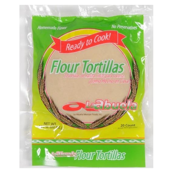 Details Ingredients ENRICHED BLEACHED FLOUR (WHEAT FLOUR, NIACIN, REDUCED IRON, THIAMINE MONONITRATE, RIBOFLAVIN, FOLIC ACID), SHORTENING (MEAT FATS, VEGETABLES OILS, BHA, PROPYL GALLATE, CITRIC ACID, DIMETHYLPOLYSILOXANE), WATER, SALT, DOUGH CONDITIONER (WHEY [MILK], L-CYSTEINE), BAKING POWDER (CORN STARCH, BICARBONATE OF SODA, SODIUM ALUMINIUM SULFATE, CALCIUM ACID PHOSPHATE). Show more Product features from A Traditional Mexican Recipe: When The Founder of La Abuela Mexican Foods, Inc. Came to The United States, She Brought W/Her A Treasured Family Recipe For Flour Tortillas. At La Abuela, We Are Dedicated to Following That Family Recipe Exactly. No Chemical Preservatives, No Dough Conditioners, No Enhancers Are Used In Preparing La Abuela Flour Tortillas. The Result Is The Delicious Flavor of A Homemade Tortilla Cooked In A Traditional Mexican Home. In Mexico, Tradition Says If Your Tortillas Puff When You Cook Them Then Your Mother In Law Loves You. When You Cook La Abuela Flour Tortillas, Your Whole Family Will Love You. Just Follow These Simple Instructions. Net Quantity of Content 20 X 31 g