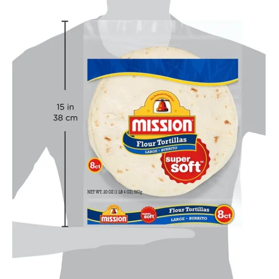 Details Ingredients Enriched Bleached Wheat Flour (Wheat Flour, Niacin, Reduced Iron, Thiamine, Mononitrate, Riboflavin, Folic Acid), Water, Vegetable Shortening (Interesterified Soybean Oil, Hydrogenated Soybean Oil and/or Palm Oil), Contains 2% or Less of: Salt, Sugar, Leavening (Sodium Bicarbonate, Sodium Aluminum Sulfate, Corn Starch, Monocalcium Phosphate and/or Sodium Acid Pyrophosphate, Calcium Sulfate), Distilled Monoglycerides, Enzymes, Wheat Starch, Calcium Carbonate, Antioxidants (Tocopherols, Ascorbic Acid, Citric Acid), Cellulose Gum, Guar Gum, Dough Conditioners (Fumaric Acid, Sodium Metabisulfite and/or Mono- and Diglycerides), Calcium Propionate, and Sorbic Acid (to Preserve Freshness). Show more Product features Mission Burrito Flour Tortillas have a freshly baked taste and super soft texture that makes them the perfect addition to any of your favorite recipes. Our 10-inch tortillas are just the right size for making overstuffed burritos, but they're versatile enough to use for everything from quesadillas to fajitas. And since our flour tortillas are made with absolutely no trans fat or cholesterol, you can feel good about serving them to your family and friends. We recommend loading our tortillas with scrambled eggs, sausage, and cheese for a tasty—and hearty—breakfast. Includes one 8 ct package of Mission Burrito Flour Tortillas. One 8 count package of Mission Burrito Flour Tortillas super soft texture 0g of trans fat per serving No cholesterol Versatile addition to any recipe Special Features Premium quality Net Quantity of Content 8.0 X 1 Tortilla