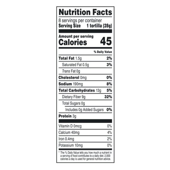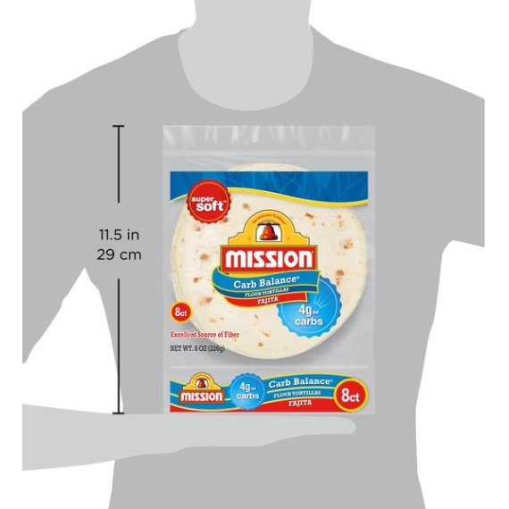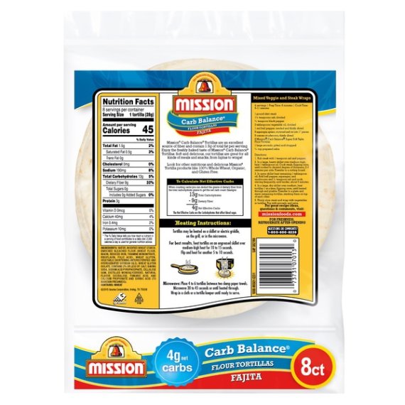 Details Ingredients WATER, MODIFIED WHEAT STARCH, ENRICHED BLEACHED FLOUR (FLOUR, NIACIN, REDUCED IRON, THIAMINE MONONITRATE, RIBOFLAVIN, FOLIC ACID), VITAL WHEAT GLUTEN, VEGETABLE SHORTENING (INTERESTERIFIED AND HYDROGENATED SOYBEAN OILS), WHEAT PROTEIN ISOLATE (WHEAT GLUTEN, LACTIC ACID, SULFITE), CONTAINS 2% OR LESS OF: SALT, BAKING SODA, SODIUM ACID PYROPHOSPHATE, CELLULOSE GUM, DISTILLED MONOGLYCERIDES, ENZYMES, NATURAL FLAVOR, SUCRALOSE, TRIGLYCERIDES, FUMARIC ACID, SUNFLOWER OIL, CANOLA OIL, AND CALCIUM PROPIONATE AND SORBIC ACID (TO MAINTAIN FRESHNESS). Show more Product features Mission Carb Balance Fajita Flour Tortillas have the super soft texture and great taste you want in a tortilla, but without all of the carbs you don't. You can feel good about using our tortillas in any of your homemade recipes because they contain only 4g of net carbs and zero sugar per serving. Our flour tortillas are also an excellent source of dietary fiber, and they're free of trans fat and cholesterol. Versatile enough for any low carb recipe, our tortillas help you feel balanced to the extreme. Try our tortillas filled with sliced turkey, sharp cheddar, and apple-arugula salad for an easy dinner everyone will love. Includes one 8 ct package of Mission Carb Balance Fajita Flour Tortillas. One 8 count package of Mission Carb Balance Fajita Flour Tortillas Only 4g of net carbohydrates per serving Excellent source of fiber No sugar and no trans fat or cholesterol Delicious addition to all of your favorite low carb recipes Net Quantity of Content 8 X 28 g