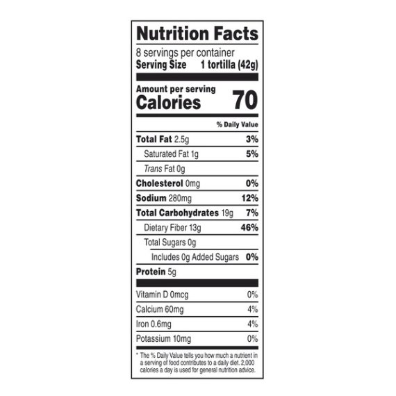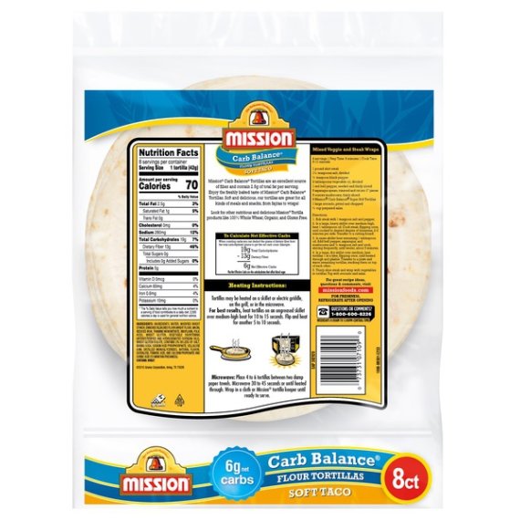 Details Ingredients Water, Modified Food Starch, Enriched Bleached Wheat Flour (Wheat Flour, Niacin, Reduced Iron, Thiamine Mononitrate, Riboflavin, Folic Acid), Vital Wheat Gluten, Powdered Cellulose, Vegetable Shortening (Interesterified Soybean Oil, Hydrogenated Soybean Oil and/or Palm Oil), Wheat Protein Isolate (Wheat Gluten, Lactic Acid, Sulfite), and Contains 2% or Less of: Salt, Leavening (Sodium Bicarbonate, Sodium Aluminum Sulfate, Corn Starch, Monocalcium Phosphate and/or Sodium Acid Pyrophosphate, Calcium Sulfate), Cellulose Gum, Preservatives (Calcium Propionate, Sorbic Acid), Distilled Monoglycerides, Enzymes, Wheat Starch, Calcium Carbonate, Antioxidants (Tocopherols, Ascorbic Acid, Citric Acid), Natural Flavor, Sunflower Oil, Sucralose, Canola Oil, Triglycerides, Dough Conditioners (Fumaric Acid, Sodium Metabisulfite and/or Mono- and Diglycerides). Show more Product features Mission Carb Balance Soft Taco Flour Tortillas have the super soft texture and great taste you crave, but without all the carbs you don't. You can feel good about treating your friends and family to our tortillas because they contain only 6g of net carbohydrates and zero sugar per serving. Our flour tortillas are also an excellent source of dietary fiber, and they don't contain any trans fat or cholesterol. Versatile enough to use in all of your favorite low carb recipes, our tortillas help you feel balanced to the extreme. We recommend filling them with seasoned chicken breast, avocado, and ranch-spiced yogurt for a quick and easy dinner. Includes one 8 ct package of Mission Carb Balance Soft Taco Flour Tortillas. One 8 count package of Mission Carb Balance Soft Taco Flour Tortillas Only 6g of net carbohydrates per serving Excellent source of fiber Zero sugar and no trans fat or cholesterol Delicious addition to all of your favorite low carb recipes Net Quantity of Content 8 X 1 Tortilla