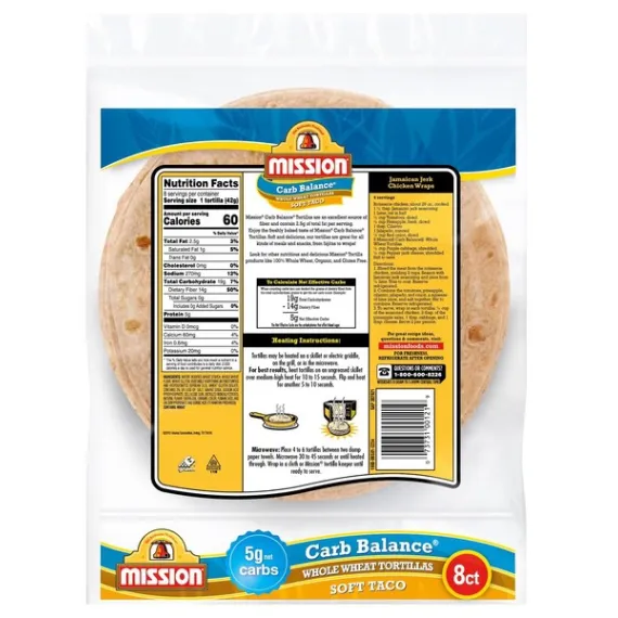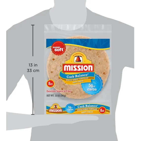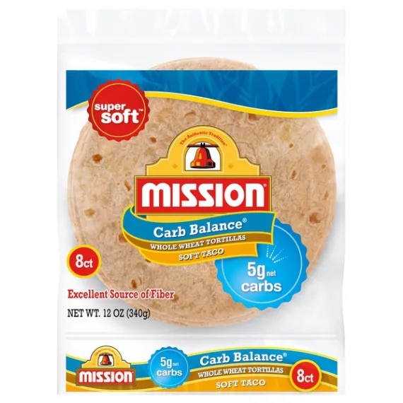 Details Ingredients WATER, MODIFIED WHEAT STARCH, WHOLE WHEAT FLOUR, VITAL WHEAT GLUTEN, VEGETABLE SHORTENING (INTERESTERIFIED AND HYDROGENATED SOYBEAN OILS), WHEAT PROTEIN ISOLATE (WHEAT GLUTEN, LACTIC ACID, SULFITE), CONTAINS 2% OR LESS OF: SALT, BAKING SODA, SODIUM ACID PYROPHOSPHATE, CELLULOSE GUM, DISTILLED MONOGLYCERIDES, ENZYMES, NATURAL FLAVOR, SUCRALOSE, CARAMEL COLOR, TRIGLYCERIDES, FUMARIC ACID, SUNFLOWER OIL, CANOLA OIL, AND CALCIUM PROPIONATE AND SORBIC ACID (TO MAINTAIN FRESHNESS). Show more Product features Mission Carb Balance Soft Taco Whole Wheat Tortillas have the supremely soft texture and great taste you want, but without all the carbs you don't. You can feel good about serving our tortillas to your friends and family because they contain 5g of net carbohydrates and zero sugar per serving. They're also cholesterol free and are an excellent source of dietary fiber. Whether you’re seeking a balanced diet or enjoy experimenting with new ingredients, our extreme low carb tortillas are versatile enough to use in all of your favorite recipes. We recommend filling them with grilled salmon, mashed avocado, and fresh arugula for a quick and easy dinner. Includes one 8 ct package of Mission Carb Balance Soft Taco Whole Wheat Tortillas. One 8 count package of Mission Carb Balance Soft Taco Whole Wheat Tortillas Only 5g of net carbohydrates per serving Excellent source of fiber Zero sugar and no trans fat or cholesterol Delicious addition to all of your favorite low carb recipes Net Quantity of Content 8 X 42 g