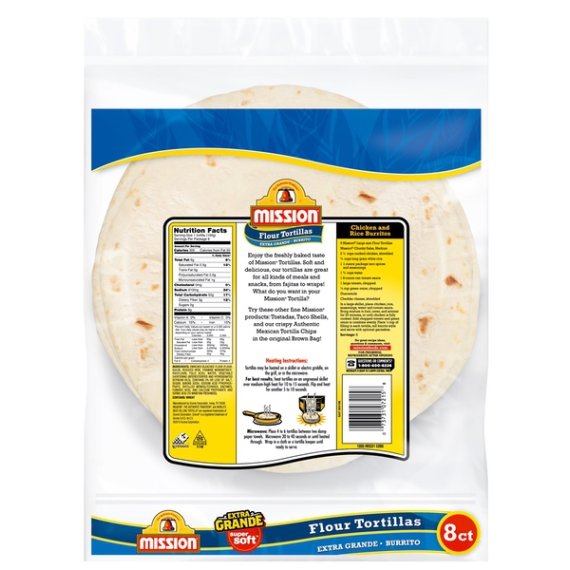 Details Ingredients ENRICHED BLEACHED WHEAT FLOUR (WHEAT FLOUR, NIACIN, REDUCED IRON, THIAMINE MONONITRATE, RIBOFLAVIN, FOLIC ACID), WATER, VEGETABLE SHORTENING (INTERESTERIFIED SOYBEAN OIL, HYDROGENATED SOYBEAN OIL AND/OR PALM OIL), CONTAINS 2% OR LESS OF: SALT, SUGAR, LEAVENING (SODIUM BICARBONATE, SODIUM ALUMINUM SULFATE, CORN STARCH, MONOCALCIUM PHOSPHATE AND/OR SODIUM ACID PYROPHOSPHATE, CALCIUM SULFATE), DISTILLED MONOGLYCERIDES, ENZYMES, WHEAT STARCH, CALCIUM CARBONATE, ANTIOXIDANTS (TOCOPHEROLS, ASCORBIC ACID, CITRIC ACID), CELLULOSE GUM, GUAR GUM, DOUGH CONDITIONERS (FUMARIC ACID, SODIUM METABISULFITE AND/OR MONO- AND DIGLYCERIDES), CALCIUM PROPIONATE AND SORBIC ACID (TO PRESERVE FRESHNESS). Show more Product features The super soft texture and fresh baked taste of Mission Extra Grande Burrito Flour Tortillas makes them the perfect complement to any homemade meal. Our tortillas are extra-large to hold all of your favorite burrito fillings, but they're versatile enough to use for everything from quesadillas to jumbo fajitas. We also craft our flour tortillas without any trans fat or cholesterol, so you can feel good about serving them to your friends and family. We recommend sandwiching strip steak, provolone cheese, and veggies between two of our flour tortillas to create a deliciously gooey cheesesteak quesadilla. Includes one 8 ct package of Mission Extra Grande Burrito Flour Tortillas. One 8 count package of Extra Grande Mission Burrito Flour Tortillas Super soft texture 0g of trans fat per serving No cholesterol Versatile addition to any recipe Net Quantity of Content 8 X 100 g