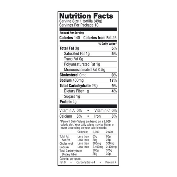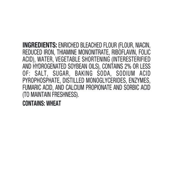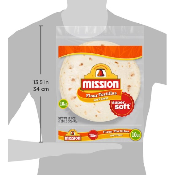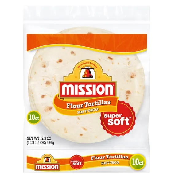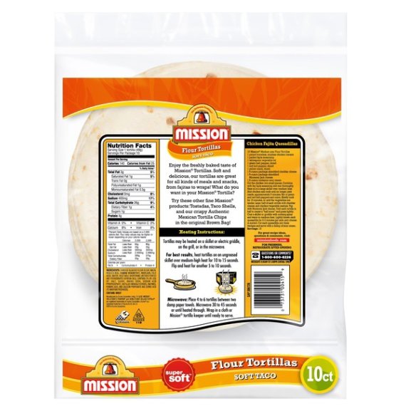 Details Ingredients ENRICHED BLEACHED FLOUR (FLOUR, NIACIN, REDUCED IRON, THIAMINE MONONITRATE, RIBOFLAVIN, FOLIC ACID), WATER, VEGETABLE SHORTENING (INTERESTERIFIED AND HYDROGENATED SOYBEAN OILS), CONTAINS 2% OR LESS OF: SALT, SUGAR, BAKING SODA, SODIUM ACID PYROPHOSPHATE, DISTILLED MONOGLYCERIDES, ENZYMES, FUMARIC ACID, AND CALCIUM PROPIONATE AND SORBIC ACID (TO MAINTAIN FRESHNESS). Show more Product features As versatile as they are delicious, Mission Soft Taco Flour Tortillas help adventurous home cooks whip up countless new recipes. Our flour tortillas aren’t just soft—they’re super soft—and this texture makes them a welcome addition to any meal. So gather friends around the dinner table and treat them to some traditional tacos, or change it up and fill the tortillas with steak and eggs for breakfast. Our soft taco tortillas also don’t contain any trans fat or cholesterol, so they’re sure to become a go-to staple in your pantry. Includes one 10 ct package of Mission Soft Taco Flour Tortillas. One 10 count package of Mission Soft Taco Flour Tortillas Super soft texture 0g of trans fat per serving No cholesterol Versatile addition to any recipe Special Features Medium size Net Quantity of Content 10 X 49 g