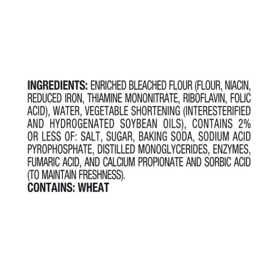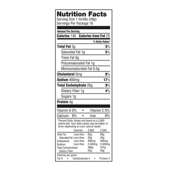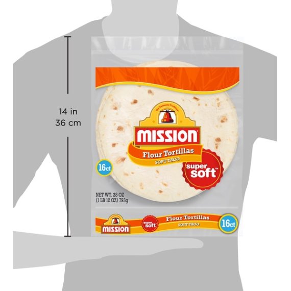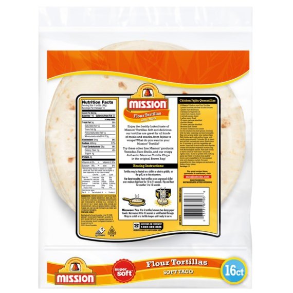 Details Ingredients ENRICHED BLEACHED FLOUR (FLOUR, NIACIN, REDUCED IRON, THIAMINE MONONITRATE, RIBOFLAVIN, FOLIC ACID), WATER, VEGETABLE SHORTENING (INTERESTERIFIED AND HYDROGENATED SOYBEAN OILS), CONTAINS 2% OR LESS OF: SALT, SUGAR, BAKING SODA, SODIUM ACID PYROPHOSPHATE, DISTILLED MONOGLYCERIDES, ENZYMES, FUMARIC ACID, AND CALCIUM PROPIONATE AND SORBIC ACID (TO MAINTAIN FRESHNESS). Show more Product features As versatile as they are delicious, Mission Soft Taco Flour Tortillas help adventurous home cooks whip up countless new recipes. Our flour tortillas aren’t just soft—they’re super soft—and this texture makes them a welcome addition to any meal. So gather friends around the dinner table and treat them to some traditional tacos, or change it up and fill the tortillas with steak and eggs for breakfast. Our soft taco tortillas also don’t contain any trans fat or cholesterol, so they’re sure to become a go-to staple in your pantry. Includes one 16 ct package of Mission Soft Taco Flour Tortillas. One 16 count package of Mission Soft Taco Flour Tortillas Super soft texture 0g of trans fat per serving No cholesterol Versatile addition to any recipe Special Features Medium size Net Quantity of Content 16 X 49 g