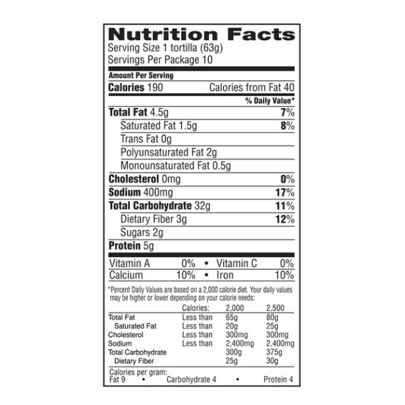 Details Ingredients Enriched Bleached Wheat Flour (Wheat Flour, Niacin, Reduced Iron, Thiamine Mononitrate, Riboflavin, Folic Acid), Water, Vegetable Shortening (Interesterified Soybean Oil, Hydrogenated Soybean Oil and/or Palm Oil), Contains 2% or Less of: Salt, Sugar, Leavening (Sodium Bicarbonate, Sodium Aluminum Sulfate, Corn Starch, Monocalcium Phosphate and/or Sodium Acid Pyrophosphate, Calcium Sulfate), Preservatives (Calcium Propionate, Sorbic Acid and/or Citric Acid), Distilled Monoglycerides, Enzymes, Wheat Starch, Calcium Carbonate, Antioxidants (Tocopherols, Ascorbic Acid), Cellulose Gum, Dough Conditioners (Fumaric Acid, Sodium Metabisulfite and/or Mono- and Diglycerides). Show more Product features Mission Soft Taco Homestyle Flour Tortillas help home cooks create a delicious and diverse range of recipes. Our flour tortillas aren’t just soft—they’re fluffier than ever before—and this texture makes them a tasty addition to any meal, from breakfast tacos to gooey quesadillas. Our soft taco tortillas are also certified kosher and don't contain any trans fat or cholesterol. We recommend loading our tortillas with seasoned shrimp, veggies, and a dollop of sour cream for a quick and easy dinner. Includes one 10 ct package of Mission Soft Taco Homestyle Flour Tortillas. One 10 count package of Mission Soft Taco Homestyle Flour Tortillas Soft, fluffy texture 0g of trans fat per serving No cholesterol Versatile addition to any recipe Special Features Premium Net Quantity of Content 10 X 63.00 g
