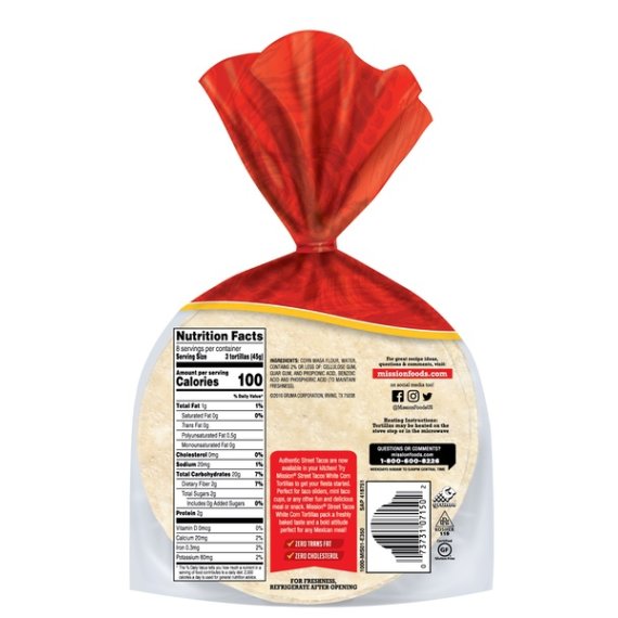 Details Ingredients CORN MASA FLOUR, WATER, CONTAINS 2% OR LESS OF: CELLULOSE GUM, GUAR GUM, AMYLASE, AND PROPIONIC ACID, BENZOIC ACID AND PHOSPHORIC ACID (TO MAINTAIN FRESHNESS). Show more Product features Mission Street Taco Corn Tortillas may be miniature in size, but they're still big on flavor. The soft texture and fresh baked flavor of our corn tortillas will inspire a world of culinary possibilities. So gather friends around the dinner table and serve up some traditional carne asada tacos, or surprise your guests with a Thai-inspired filling of chicken and peanut sauce. Our tortillas are also easy to incorporate into any menu because they're certified gluten free and don't contain any trans fat, lard, or cholesterol. Though they're versatile enough for any recipe, we recommend trying our tortillas with Hawaiian pork and pineapple. Includes one 24 ct package of Mission Street Taco Corn Tortillas. One 24 count package of Mission Street Taco Corn Tortillas Soft texture and authentic taste Certified gluten free No trans fat, lard, or cholesterol Versatile addition to any recipe Net Quantity of Content 8 X 44 g