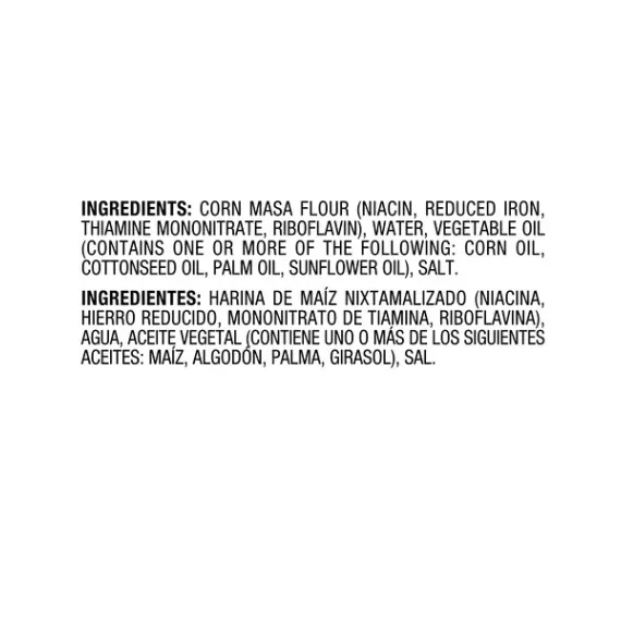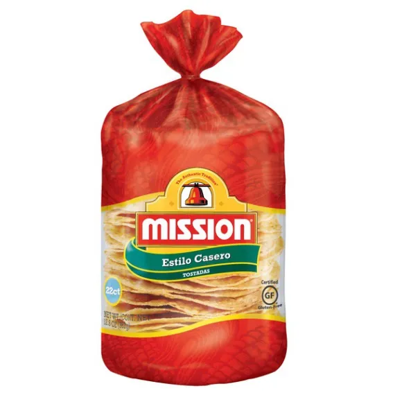 Details Ingredients CORN MASA FLOUR (NIACIN, REDUCED IRON, THIAMINE MONONITRATE, RIBOFLAVIN), WATER, VEGETABLE OIL (CONTAINS ONE OR MORE OF THE FOLLOWING: CORN OIL, COTTONSEED OIL, PALM OIL, SUNFLOWER OIL), SALT. Show more Product features No matter how you top them, Mission Yellow Tostada Caseras have an authentic flavor and satisfying crunch that complements any meal. As versatile as they are delicious, our tostadas will become a go-to ingredient for all of your favorite snacks, appetizers, and entrees. Our tostadas are also certified gluten free, and they don't contain any trans fat or cholesterol. We recommend topping our tostadas with fresh shrimp ceviche and avocado salsa for a delicious snack that everyone will love. Includes one 22 ct package of Mission Yellow Tostada Caseras. One 22 count package of Mission Yellow Tostada Caseras Authentic taste and crunchy texture Certified gluten free No trans fat or cholesterol Versatile addition to any recipe