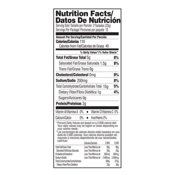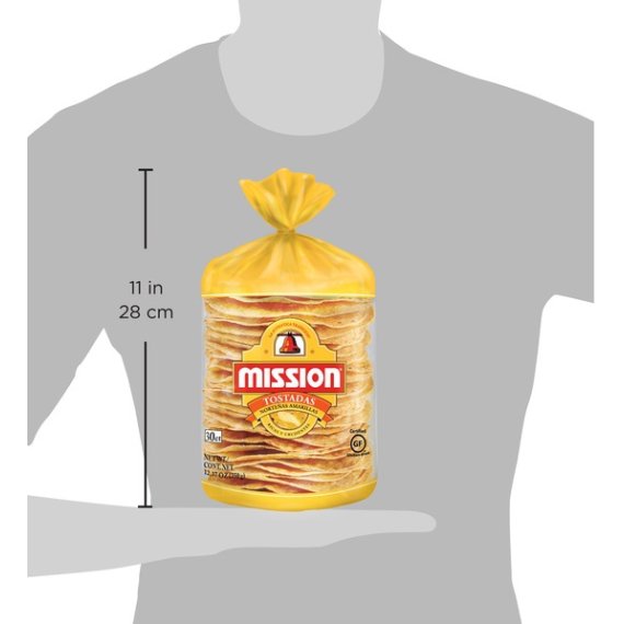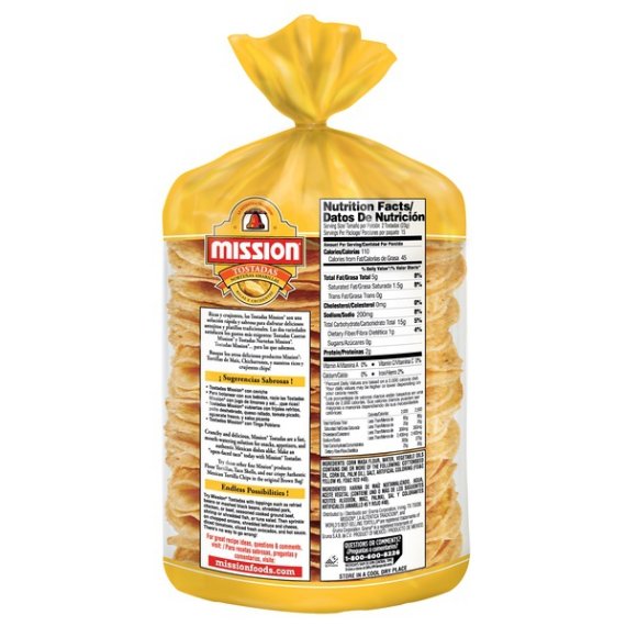 Details Ingredients GROUND CORN TREATED WITH LIME, WATER, VEGETABLE OILS (CONTAINS ONE OR MORE OF THE FOLLOWING: COTTONSEED OIL, CORN OIL, PALM OIL), SALT, ARTIFICIAL COLORING (FD&C YELLOW #5, FD&C RED #40). Show more Product features No matter what you top them with, Mission Yellow Tostadas Norteñas have an authentic flavor and satisfying crunch that pairs well with any recipe. As versatile as they are delicious, our tostadas add extra flair to all of your family's favorite snacks, appetizers, and entrees. Our tostadas are also certified gluten free, and they're made without any trans fat or cholesterol. Though the ways to top them are endless, we recommend loading our tostadas with fresh shrimp ceviche for a delicious appetizer that's sure to impress. Includes one 30 ct package of Mission Yellow Tostadas Norteñas. One 30 count package of Mission Yellow Tostadas Norteñas Authentic taste and crunchy texture Certified gluten free No trans fat or cholesterol Versatile addition to any recipe Net Quantity of Content 15 X 23 g