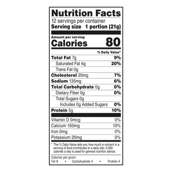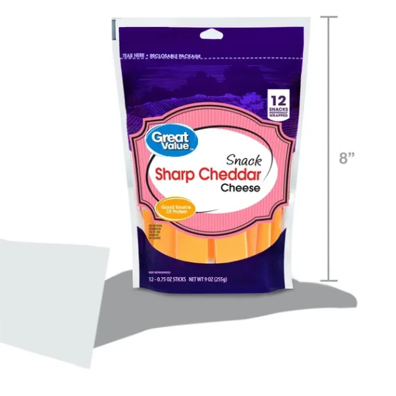 Details Ingredients Pasteurized Milk, Cheese Cultured Salt Enzymes, Annatto Color. Product features Great Value Sharp Cheddar Cheese come in fun, bite size blocks making it perfect for cooking with and snacking on. With just the right amount of sharpness, each bite melts in your mouth into a dense, creamy texture. The block makes it easy to slice, dice and shred. This cheese is perfect for slicing up and serving on a cheese platter at a party with a side of crackers. This cheddar cheese can also be used in mac and cheese, on top of burgers or sandwiches, scalloped potatoes and so many more recipes. This delicious cheese is made from pasteurized milk and offers nutritional benefits as it is a good source of protein and calcium. This package is resealable to help maintain freshness and comes with 12 individually wrapped small cheddar blocks so you can stock up for continued enjoyment. Enjoy the fresh taste of Great Value Sharp Cheddar Cheese Snack Blocks. Great Value products provide families with affordable, high quality grocery and household consumable options. With our wide range of product categories spanning grocery and household consumables, we offer you a variety of products for your family's needs. Our products are conveniently available online and in Walmart stores nationwide, allowing you to stock up and save money at the same time. Great Value Cheddar Cheese Snack Blocks, Sharp, 9 oz, 12 Count: Includes 12 - 0.75 oz blocks Individually wrapped Great for snacking Easy to slice, dice and shred Good source of protein and calcium Gluten-free
