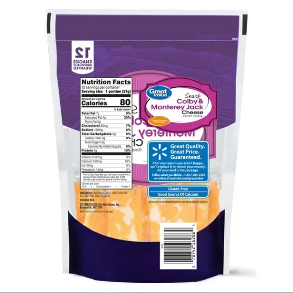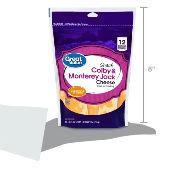 Details Ingredients Pasteurized Milk, Cheese Cultured Salt Enzymes, Annatto Color. Product features Great Value Colby & Monterey Jack Cheese Snack Blocks are sure to please your taste buds. This combination of Colby and Monterey jack cheeses features just the right amount of sharpness, each bite melts in your mouth into a dense, creamy texture. The blocks makes it easy to slice, dice, and shred. It is perfect for slicing up and serving on a cheese platter at a party with a side of crackers. This Colby & Monterey Jack cheese can also be used in mac and cheese, on top of burgers or sandwiches, scalloped potatoes and so many more recipes. This delicious cheese is made from pasteurized milk and offers nutritional benefits as it is a good source of protein and calcium. This package is resealable to help maintain freshness and comes with 12 individually wrapped small blocks so you can stock up for continued enjoyment. Enjoy the fresh taste of Great Value Colby & Monterey Jack Cheese Snack Blocks. Great Value products provide families with affordable, high quality grocery and household consumable options. With our wide range of product categories spanning grocery and household consumables, we offer you a variety of products for your family's needs. Our products are conveniently available online and in Walmart stores nationwide, allowing you to stock up and save money at the same time. Great Value Colby & Monterey Jack Cheese Snack Blocks, 9 oz, 12 Count: Includes 12 - 0.75 oz blocks Individually wrapped Great for snacking Easy to slice, dice and shred Good source of protein and calcium Gluten-free