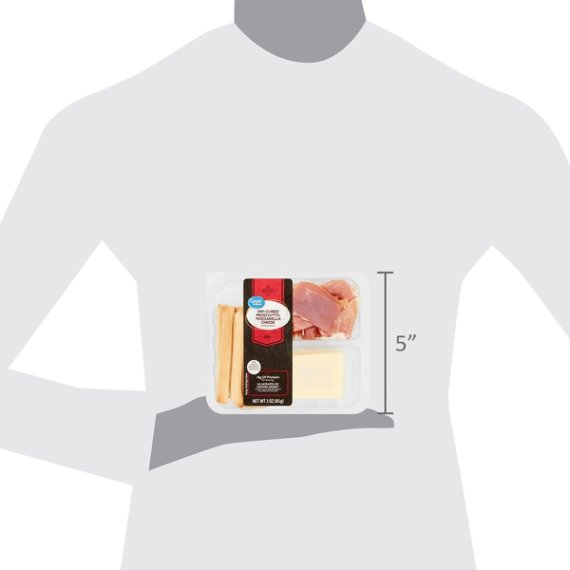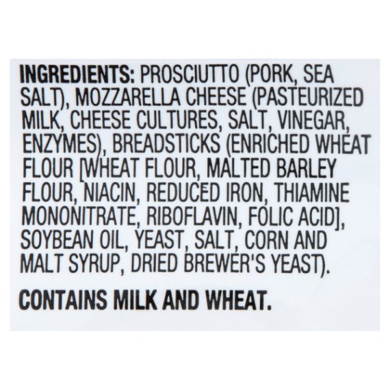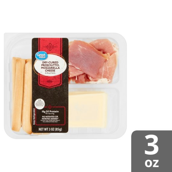 Details Ingredients Prosciutto (Pork, Sea Salt), Mozzarella Cheese (Pasteurized Milk, Cheese Cultures, Salt, Vinegar, Enzymes), Breadsticks (Enriched Wheat Flour [Wheat Flour, Malted Barley Flour, Niacin, Reduced Iron, Thiamine Mononitrate, Riboflavin, Folic Acid], Soybean Oil, Yeast, Salt, Corn and Malt Syrup, Dried Brewer's Yeast) Show more Product features No nitrates or nitrites added* *Except for those naturally occurring in sea salt Take snacktime to the next level with Great Value Dry-Cured Prosciutto, Mozzarella Cheese & Bread Sticks. This delicious 3-ounce package includes a perfectly portioned amount of each savory treat and is ready to enjoy whenever you need it. Pop a few in your home refrigerator, or keep them chilled at work for a meal on the go. Each serving boasts 18 grams of protein— more than one-third or your daily recommended value! Make curbing your hunger cravings as convenient as it is tasty with Great Value Dry-Cured Prosciutto, Mozzarella Cheese & Bread Sticks. Great Value products provide families with affordable, high quality grocery and household consumable options. With our wide range of product categories spanning grocery and household consumables, we offer you a variety of products for your family's needs. Our products are conveniently available online and in Walmart stores nationwide, allowing you to stock up and save money at the same time. Dry-cured prosciutto, mozzarella cheese, and bread sticks No nitrates or nitrites added 18g protein per serving 3oz package Net Quantity of Content 1 X 1 package (85g)