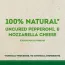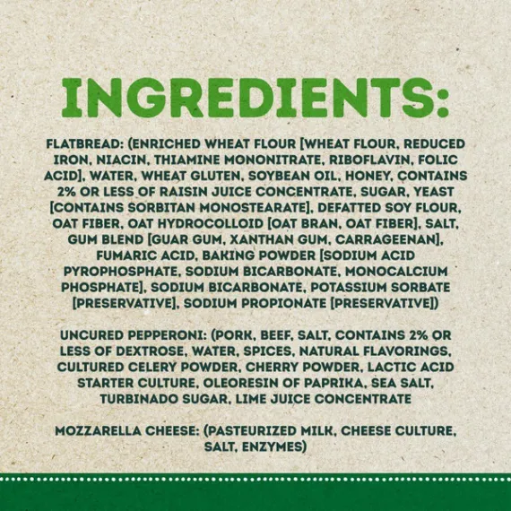 Details Ingredients Flatbread (Enriched Wheat Flour [Wheat Flour, Reduced Iron, Niacin, Thiamine Mononitrate, Riboflavin, Folic Acid], Water, Wheat Gluten, Soybean Oil, Honey, Contains 2% Or Less Of Raisin Juice Concentrate, Sugar, Yeast [Contains Sorbitan Monostearate], Defatted Soy Flour, Oat Fiber, Oat Hydrocolloid [Oat Bran, Oat Fiber], Salt, Gum Blend [Guar Gum, Xanthan Gum, Carrageenan], Fumaric Acid, Baking Powder [Sodium Acid Pyrophosphate, Sodium Bicarbonate, Monocalcium Phosphate], Sodium Bicarbonate, Potassium Sorbate [Preservative], Sodium Propionate [Preservative]), Uncured Pepperoni (Pork, Beef, Salt, Contains 2% Or Less of Dextrose, Water, Spices, Natural Flavorings, Cultured Celery Powder, Cherry Powder, Lactic Acid Starter Culture, Oleoresin of Paprika, Sea Salt, Turbinado Sugar, Lime Juice Concentrate), Mozzarella Cheese (Pasteurized Milk, Cheese Culture, Salt, Enzymes). Show more Product features Bring home all the classic and savory flavors of pepperoni pizza. No added nitrates or nitrites except for those naturally occurring in celery and cherry powder. Uncured pepperoni meets smooth mozzarella in a delicious wrap you can feel good about. Try it warm or cold. MAKE THE NATURAL CHOICE. NATURAL CHOICE is a trademark of Jennie-O Turkey Store, LLC. 100% natural** meat and cheese (except flatbread)14 grams of protein290 calories per serving**Minimally processed, no artificial ingredients Net Quantity of Content 1 X 77.00 g