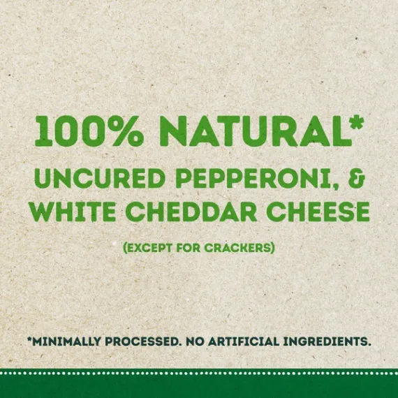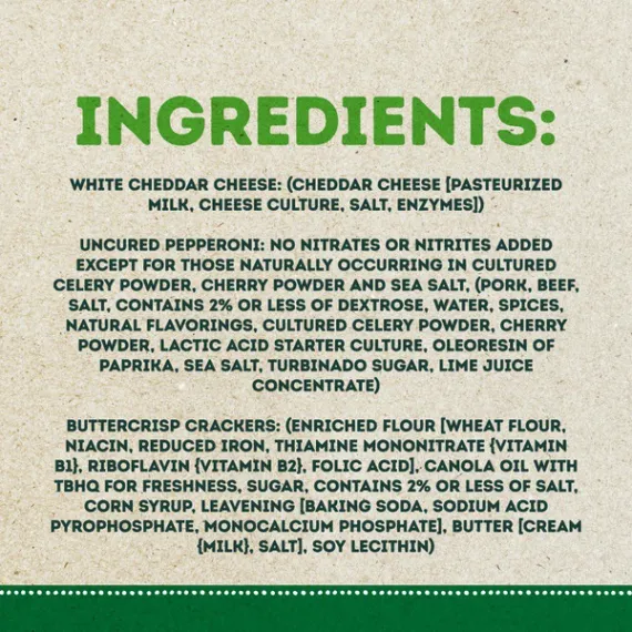 Details Ingredients WHITE CHEDDAR CHEESE (CHEDDAR CHEESE [PASTEURIZED MILK, CHEESE CULTURE, SALT, ENZYMES]), UNCURED PEPPERONI NO NITRATES OR NITRITES ADDED EXCEPT FOR THOSE NATURALLY OCCURRING IN CULTURED CELERY POWDER, CHERRY POWDER AND SEA SALT, (PORK, BEEF, SALT, CONTAINS 2% OR LESS OF DEXTROSE, WATER, SPICES, NATURAL FLAVORINGS, CULTURED CELERY POWDER, CHERRY POWDER, LACTIC ACID STARTER CULTURE, OLEORESIN OF PAPRIKA, SEA SALT, TURBINADO SUGAR, LIME JUICE CONCENTRATE), BUTTERCRISP CRACKERS (ENRICHED FLOUR [WHEAT FLOUR, NIACIN, REDUCED IRON, THIAMINE MONONITRATE {VITAMIN B1}, RIBOFLAVIN {VITAMIN B2}, FOLIC ACID], CANOLA OIL WITH TBHQ FOR FRESHNESS, SUGAR, CONTAINS 2% OR LESS OF SALT, CORN SYRUP, LEAVENING [BAKING SODA, SODIUM ACID PYROPHOSPHATE, MONOCALCIUM PHOSPHATE], BUTTER [CREAM {MILK}, SALT], SOY LECITHIN). Show more Product features The wholesome snack that you can stack! Start with a cracker for a little crunch and pile up our tasty 100% all-natural (minimally processed, no artificial ingredients) pepperoni with smooth white cheddar. Experience a snack that you can feel great about. MAKE THE NATURAL CHOICE. NATURAL CHOICE is a trademark of Jennie-O Turkey Store, LLC. 100% natural** meat and cheese (except crackers)11 grams of protein300 calories per servingUncured pepperoni with no nitrates or nitrites added except for those naturally occurring in cultured celery juice powder and sea salt**Minimally processed, no artificial ingredients Net Quantity of Content 1 X 65 g
