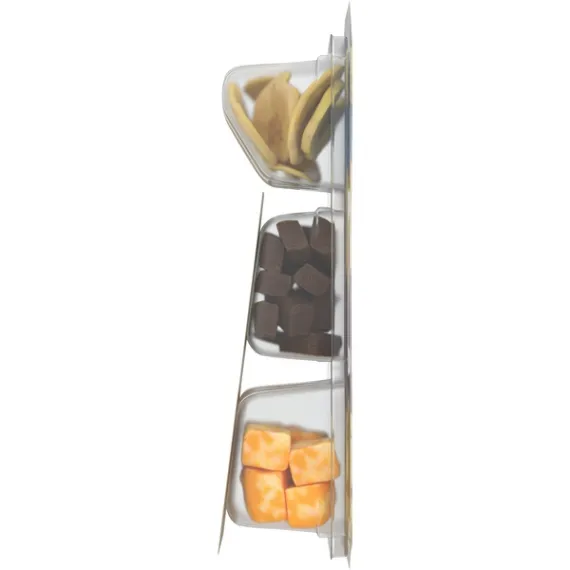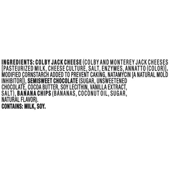 Details Ingredients Colby And Monterey Jack Cheeses—Marbled Colby And Monterey Jack Cheese (Pasteurized Milk, Cheese Culture, Salt, Enzymes, Annatto [Color]), Modified Food Starch, Natamycin (A Natural Mold Inhibitor). Contains: Milk. Semisweet Chocolate—Sugar, Unsweetened Chocolate, Cocoa Butter, Soy Lecithin, Vanilla Extract, Salt. Contains: Soy. Manufactured On Equipment That Also Processes Milk. Banana Chips—Bananas, Coconut Oil, Sugar, Natural Flavor. Show more Product features Kraft Trios Snackfulls Colby and Monterey Jack, Semisweet Chocolate and Banana Chips Snack Packs offer well-balanced snacking when you're on the go. Each snack pack includes Colby and Monterey Jack cheeses, semisweet chocolate and banana chips, all portioned in a conveniently portable tray. Savor each snack one by one, or make your own mix of savory, sweet and creamy flavors. This single serve snack is a good source of protein, making it great to help curb your hunger at work, home or on the road. This 2.25 ounce pack of Kraft Trios features a tray to keep each snack separate. Keep Kraft Trios Snackfulls Colby and Monterey Jack, Semisweet Chocolate and Banana Chips refrigerated. One 2.25 oz. Kraft Trios Snackfulls Colby & Monterey Jack, Semisweet Chocolate and Banana Chips These Kraft Trios Snackfulls have a mix of savory, sweet and creamy flavors Snack is full of Colby and Monterey Jack cheeses, semisweet chocolate and banana chips Well-balanced snacking when you're on the go A good source of protein Sealed tray, perfect to eat at home or take with you Keep refrigerated until ready to enjoy Net Quantity of Content 1.0 X 1 package (63.7g)