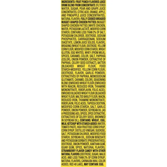 Details Ingredients Ingredients: FRUIT PUNCH FLAVORED JUICE DRINK BLEND FROM CONCENTRATE - WATER; HIGH FRUCTOSE CORN SYRUP; PEAR AND GRAPE JUICE CONCENTRATES; CITRIC ACID; WATER EXTRACTED ORANGE, APPLE, AND PINEAPPLE JUICE CONCENTRATES; NATURAL FLAVOR; VITAMIN E ACETATE. FULLY COOKED BREADED NUGGET-SHAPED CHICKEN PATTIES - (NUGGET-SHAPED CHICKEN PATTIES - WHITE CHICKEN, WATER, POTASSIUM LACTATE, MODIFIED CORN STARCH, CONTAINS LESS THAN 2% OF SALT, POTASSIUM CHLORIDE, DEXTROSE, SODIUM PHOSPHATES, CARRAGEENAN, SODIUM DIACETATE, LEMON JUICE SOLIDS, FLAVOR. BREADING - WHEAT FLOUR, DEXTROSE, YELLOW CORN FLOUR, MODIFIED CORN STARCH, WHEAT GLUTEN, EGG WHITES, WHEY [FROM MILK], SPICES, CARAMEL COLOR, SALT, PAPRIKA [COLOR], ONION POWDER, EXTRACTIVE OF PAPRIKA, CELERY SEED EXTRACT. BATTER - BLEACHED WHEAT FLOUR, FOOD STARCH-MODIFIED, YELLOW CORN FLOUR, DEXTROSE, FLAVOR, GARLIC POWDER, EXTRACTIVES OF PAPRIKA, MONOSODIUM GLUTAMATE, CARAMEL COLOR. SEASONING BLEND - ENRICHED BLEACHED WHEAT FLOUR [BLEACHED WHEAT FLOUR, MALTED BARLEY FLOUR, NIACIN, REDUCED IRON, THIAMINE MONONITRATE, RIBOFLAVIN, FOLIC ACID], EGG WHITES, MODIFIED FOOD STARCH, SALT, GARLIC POWDER, ONION POWDER, PARTIALLY HYDROGENATED SOYBEAN OIL, SPICES, NATURAL FLAVOR. BROWNED IN SOYBEAN OIL.) CONTAINS: WHEAT, EGG, MILK. KETCHUP WITH STARCH ADDED - WATER, TOMATO PASTE, HIGH FRUCTOSE CORN SYRUP, CORN SYRUP, DISTILLED VINEGAR, SUCROSE, SALT, POTASSIUM CHLORIDE, MODIFIED FOOD STARCH, SOYBEAN OIL, SODIUM BENZOATE AND POTASSIUM SORBATE (PRESERVATIVES), DEXTROSE, ONION POWDER, XANTHAN GUM, GUAR GUM, SPICE, NATURAL FLAVOR. ARTIFICIALLY FLAVORED STRAWBERRY CANDY - DEXTROSE, SUGAR, MALIC ACID, AND LESS THAN 2% OF CORN SYRUP, ARTIFICIAL FLAVORS, CARNAUBA WAX, COLOR ADDED, RED 40 LAKE. MAY CONTAIN EGG. Show more Product features Lunchables Lunch Combinations Chicken Dunks are the perfect choice for an on the go lunch, while letting kids have fun with their food. This convenient box lunch includes Oscar Mayer breaded white meat chicken nuggets and ketchup as dipping sauce. The chicken dunks lunch kit also includes a Capri Sun Fruit Punch drink and Nerds candy snack. This tasty breaded chicken meal kit is a fast and fun option for school lunch, picnics or on the go snacking. It provides a good source of calcium and protein, with 9 grams of protein per serving. Refrigerate this conveniently packaged 9.8 ounce Lunchables Lunch Combinations. One 9.8 oz. Lunchables Lunch Combinations Chicken Dunks Lunchables Lunch Combinations are packed with kids' favorites, giving more choices for lunchtime Contains white meat chicken nuggets, ketchup, Capri Sun and Nerds candy This ready to eat kit is perfect for school lunch Good source of protein with 9 g. of protein per serving Chicken kit comes packaged in a convenient, sealed tray with individual sections for each ingredient Keep on the go package refrigerated Special Features 100% white meat Net Quantity of Content 1.0 X 1 package