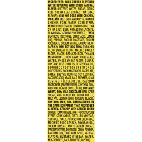 Details Ingredients Ingredients: CHERRY FLAVORED WATER BEVERAGE WITH OTHER NATURAL FLAVOR - WATER, HIGH FRUCTOSE CORN SYRUP, CITRIC ACID, SUCRALOSE (SPLENDA? BRAND SWEETENER), NATURAL FLAVOR. MINI HOT DOGS MADE WITH CHICKEN, PORK AND BEEF - MECHANICALLY SEPARATED CHICKEN, PORK, WATER, CORN SYRUP, MODIFIED FOOD STARCH, CONTAINS LESS THAN 2% OF SALT, BEEF, POTASSIUM LACTATE, FLAVORINGS, SODIUM PHOSPHATES, LEMON DEXTROSE (DEXTROSE, CITRIC ACID, LEMON OIL), PAPRIKA, SODIUM DIACETATE, SODIUM ASCORBATE, SODIUM NITRITE, EXTRACTIVE OF PAPRIKA. MINI HOT DOG BUNS - ENRICHED BLEACHED FLOUR (WHEAT FLOUR, MALTED BARLEY FLOUR, NIACIN, REDUCED IRON, THIAMIN MONONITRATE, RIBOFLAVIN, FOLIC ACID), WATER, WHOLE WHEAT FLOUR, SUGAR, CONTAINS LESS THAN 2% OF SOYBEAN OIL, DOUGH CONDITIONERS (MONO & DIGLYCERIDES, SODIUM STEAROYL LACTYLATE, DATEM, ENZYME MODIFIED SOY LECITHIN, ASCORBIC ACID), YEAST, SALT, ENZYMES, GUAR GUM, METHYLCELLULOSE, CALCIUM PROPIONATE (PRESERVATIVE), XANTHAN GUM, ARTIFICIAL FLAVOR, SOY LECITHIN. CONTAINS: WHEAT, SOY. MILK CHOCOLATE BAR - MILK CHOCOLATE (SUGAR; MILK; CHOCOLATE; COCOA BUTTER; LACTOSE; MILK FAT; SOY LECITHIN; PGPR, EMULSIFIER; VANILLIN, ARTIFICIAL FLAVOR). CONTAINS: SOY, MILK. MANUFACTURED ON THE SAME EQUIPMENT THAT PROCESSES ALMONDS. KETCHUP WITH STARCH ADDED - WATER, TOMATO PASTE, HIGH FRUCTOSE CORN SYRUP, CORN SYRUP, DISTILLED VINEGAR, SUCROSE, SALT, POTASSIUM CHLORIDE, MODIFIED FOOD STARCH, SOYBEAN OIL, SODIUM BENZOATE AND POTASSIUM SORBATE (PRESERVATIVES), DEXTROSE, ONION POWDER, XANTHAN GUM, GUAR GUM, SPICE, NATURAL FLAVOR. MUSTARD - VINEGAR, WATER, MUSTARD SEED, SALT, TURMERIC, PAPRIKA. Show more Product features Lunchables Lunch Combinations Mini Hot Dogs are the perfect choice for an on the go lunch, while letting kids have fun with their food. This convenient box lunch includes two mini hot dogs made with chicken, pork and beef, two mini hot dog buns, ketchup and mustard. The hot dog lunch kit also includes a Capri Sun Roarin'Waters Wild Cherry Waterfall drink and a Hershey's chocolate bar for dessert. This tasty meal kit is a fast and fun option for school lunch, picnics or on the go snacking. It provides a good source of calcium and protein, with 8 grams of protein per serving. Refrigerate this conveniently packaged 9.3 ounce Lunchables Lunch Combinations. One 9.3 oz. Lunchables Lunch Combinations Mini Hot Dogs Lunchables Lunch Combinations are packed with kids' favorites, giving more choices for lunchtime Contains mini hot dogs, mini hot dog buns, ketchup, mustard, Capri Sun and Hershey's candy dessert This ready to eat kit is perfect for school lunch Good source of protein with 8 g. of protein per serving Hot dog kit comes packaged in a convenient, sealed tray with individual sections for each ingredient Keep on the go package refrigerated Net Quantity of Content 1.0 X 1 package
