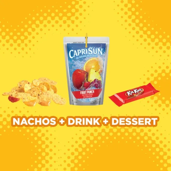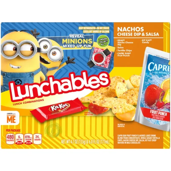 Details Ingredients INGREDIENTS: FRUIT PUNCH FLAVORED JUICE DRINK BLEND FROM CONCENTRATE - FILTERED WATER; SUGAR; PEAR AND GRAPE JUICE CONCENTRATES; CITRIC ACID; ORANGE, APPLE, AND PINEAPPLE JUICE CONCENTRATES; NATURAL FLAVOR. TORTILLA CHIPS - GROUND YELLOW CORN, VEGETABLE OIL (CONTAINS ONE OR MORE OF THE FOLLOWING: CORN, SUNFLOWER OR SOYBEAN OIL), CORN BRAN AND SALT. NACHO CHEESE - WHEY, MILK, CANOLA OIL, DRIED CORN SYRUP, WATER, SODIUM PHOSPHATE, CONTAINS LESS THAN 2% OF JALAPENO PEPPERS, SALT, WHEY PROTEIN CONCENTRATE, LACTIC ACID, MILKFAT, SODIUM ALGINATE, VINEGAR, CALCIUM PHOSPHATE, POTASSIUM CHLORIDE, SORBIC ACID AS A PRESERVATIVE, CHEESE CULTURE, ENZYMES, NATURAL FLAVOR, APOCAROTENAL (COLOR). CONTAINS: MILK. SALSA - WATER, TOMATO PASTE, GREEN CHILI PEPPERS, VINEGAR, DEHYDRATED ONIONS, CONTAINS LESS THAN 2% OF HIGH FRUCTOSE CORN SYRUP, FOOD STARCH-MODIFIED, JALAPENO PEPPERS, SALT, GREEN BELL PEPPERS, GARLIC POWDER, SODIUM BENZOATE AND POTASSIUM SORBATE AS PRESERVATIVES, CITRIC ACID, SPICE. CRISP WAFERS IN MILK CHOCOLATE- SUGAR; WHEAT FLOUR; NONFAT MILK; COCOA BUTTER; CHOCOLATE; PALM KERNEL OIL; MILK FAT; LACTOSE (MILK); CONTAINS 2% OR LESS OF: LECITHIN (SOY); PGPR (EMULSIFIER); VANILLIN (ARTIFICIAL FLAVOR); SALT; YEAST; BAKING SODA. CONTAINS: WHEAT, MILK, SOY. MANUFACTURED IN A FACILITY THAT ALSO PROCESSES PEANUTS. Show more Product features Lunchables Lunch Combinations Nacho Cheese Dip & Salsa are the perfect choice for an on the go lunch, while letting kids have fun with their food. This convenient box lunch includes tortilla chips, salsa and Kraft nacho cheese dip along with a Capri Sun Fruit Punch drink. A Kit Kat candy bar serves as dessert. This nacho chips and salsa meal kit is a fast and fun option for school lunch, picnics or on the go snacking. It provides an excellent source of calcium, see nutrition information for fat, saturated fat and sodium content. Each chips and dip meal kit comes packaged in a sealed lunch tray with individual sections for each ingredient. Refrigerate this conveniently packaged 10.7 ounce Lunchables Lunch Combinations. One 10.7 oz. Lunchables Lunch Combinations Nacho Cheese Dip & Salsa Lunchables Lunch Combinations are packed with kids' favorites, giving more choices for lunchtime Contains tortilla chips, salsa, Kraft nacho cheese dip, Capri Sun Fruit Punch drink and Kit Kat bar This ready to eat kit is perfect for school lunch Excellent source of calcium, see nutrition information for fat, saturated fat and sodium content Nachos kit comes packaged in a convenient, sealed lunch tray Keep on the go package refrigerated Special Features Kraft nacho cheese dip, And a nestle crunch Net Quantity of Content 1.0 X 1 package