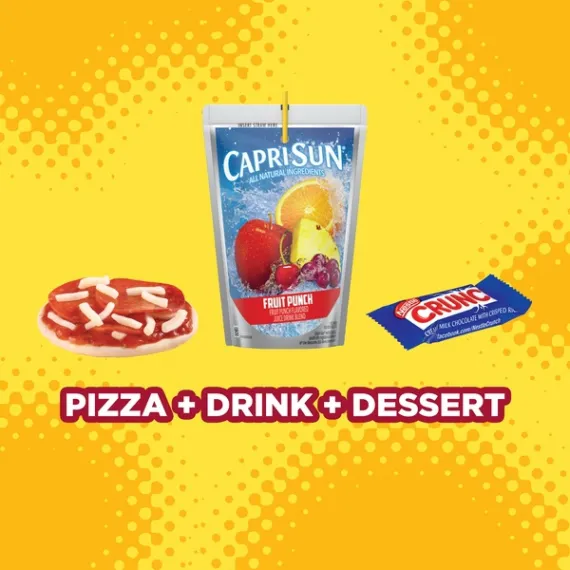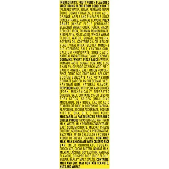 Details Ingredients Fruit Punch Flavored Juice Drink Blend From Concentrate (Filtered Water, Sugar, Pear And Grape Juice Concentrates, Citric Acid, Orange, Apple And Pineapple Juice Concentrates, Natural Flavor); Pizza Crust (Wheat Flour [Enriched Bleached Wheat Flour, [Flour, Niacin, Reduced Iron, Thiamin Mononitrate, Riboflavin, Folic Acid], Whole Wheat Flour], Water, Sugar, Glycerin, Soybean Oil, Contains 2% Or Less Of: Yeast, Vital Wheat Gluten, Mono & Diglycerides, Salt, Xanthan Gum, Calcium Propionate, Sorbic Acid, Natural And Artificial Flavor, Enzyme), Contains: Wheat; Pizza Sauce (Water, Tomato Paste, Sugar, Contains Less Than 2% Of Food Starch Modified, Garlic Powder, Salt, Onion Powder, Spice, Citric Acid, Dried Basil, Sea Salt, Sodium Benzoate And Potassium Sorbate [Added As Preservatives], Xanthan Gum, Natural Flavor); Pepperoni Made With Pork And Chicken (Pork, Mechanically Separated Chicken, Salt, Contains 2% Or Less Of Pork Stock, Spices [Including Mustard], Dextrose, Lactic Acid Starter Culture, Oleoresin Of Paprika, Flavoring, Sodium Ascorbate, Sodium Nitrite, Bha, Bht, Citric Acid); Mozzarella Pasteurized Prepared Cheese Product (Pasteurized Part Skim Milk, Water, Milk Protein Concentrate, Salt, Sodium Citrate, Milkfat, Cheese Culture, Sorbic Acid As A Preservative, Enzymes, With Cellulose Powder Added To Prevent Caking), Contains: Milk; Milk Chocolate With Crisped Rice Bar (Milk Chocolate [Sugar, Chocolate, Cocoa Butter, Nonfat Milk, Milkfat, Lactose, Soy Lecithin, Natural Flavor], Crisped Rice [Rice Flour, Sugar, Barley Malt, Salt]), Contains: Milk And Soy, May Contain Peanuts, Nuts And Wheat. Show more Product features Lunchables Lunch Combinations Pizza with Pepperoni are the perfect choice for an on the go lunch, while letting kids have fun with their food. This convenient box lunch includes pizza crusts, pizza sauce, Kraft mozzarella pasteurized prepared cheese product, and pepperoni made with pork and chicken. Each kit makes three personal pizza snacks. The pepperoni pizza lunch kit also includes a Capri Sun Fruit Punch and Nestle Crunch chocolate bar for dessert. This tasty pizza meal kit is a fast and fun option for school lunch, picnics or on the go snacking. It provides an excellent source of calcium and protein, with 15 grams of protein per serving. Refrigerate this conveniently packaged 10.7 ounce Lunchables Lunch Combinations. One 10.7 oz. Lunchables Lunch Combinations Pizza with Pepperoni Lunchables Lunch Combinations are packed with favorites, giving more choices for lunchtime Contains pizza crusts, Kraft mozzarella, pizza sauce and pepperoni This ready to eat kit is perfect for school lunch Excellent source of protein with 15 g. of protein per serving Pizza kit comes packaged in a convenient, sealed tray with individual sections for each ingredient Keep on the go package refrigerated Special Features Excellent source of calcium Net Quantity of Content 1.0 X 1 package