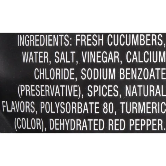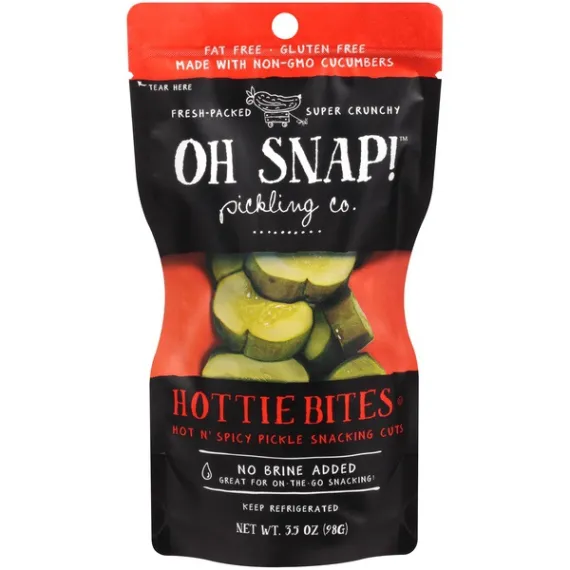 Details Ingredients FRESH CUCUMBERS, WATER, SALT, VINEGAR, CALCIUM CHLORIDE, SODIUM BENZOATE (PRESERVATIVE), SPICES, NATURAL FLAVORS, POLYSORBATE 80, TURMERIC (COLOR), DEHYDRATED RED PEPPER. Show more Product features Satisfy hunger between meals with these Oh Snap Pickles Bites Hot 'N Spicy Pickle Snacking Cuts, 3.5 oz. Pouch. They're made with non-GMO cucumbers and a unique blend of spices giving you a delicious treat with crunch. These pickles in a pouch have no brine added for less mess. They also have zero calories and are fat and gluten-free. They're a convenient and tasty snack for home, school, work, picnics and travel. Oh Snap! Hottie Bites: Hot and spicy pickle snacking cuts No brine added means less mess Super crunchy Fat and gluten-free Non-GMO cucumbers 0 calories No cholesterol Net weight: 3.5 oz Resealable pouch Oh Snap! hot pickles ideal for on-the-go snacking Net Quantity of Content ABOUT 3 X 1 oz