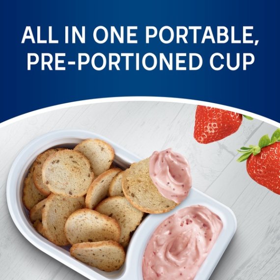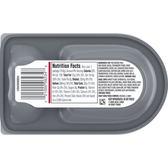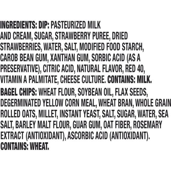 Details Ingredients Ingredients: Dip: Pasteurized Milk And Cream, Sugar, Strawberry Puree, Dried Strawberries, Water, Salt, Modified Food Starch, Carob Bean Gum, Xanthan Gum, Sorbic Acid (As A Preservative), Citric Acid, Natural Flavor, Red 40, Vitamin A Palmitate, Cheese Culture. Contains: Milk. Bagel Chips: Wheat Flour, Soybean Oil, Flax Seeds, Degerminated Yellow Corn Meal, Wheat Bran, Whole Grain Rolled Oats, Millet, Instant Yeast, Salt, Sugar, Water, Sea Salt, Barley Malt Flour, Guar Gum, Oat Fiber, Rosemary Extract (Antioxidant), Ascorbic Acid (Antioxidant). Contains: Wheat. Show more Product features Philadelphia Bagel Chips and Strawberry Cream Cheese Dip is a great way to snack on the go. Enjoy the perfect flavor combination of multigrain bagel chips with a sweet strawberry cream cheese dip. This ready to serve tray makes a delicious snack at home or a quick and easy lunch at work. Just open the convenient serving tray and you're ready to eat. This delicious snack is made with real fruit and no artificial flavors. This 2.5 ounce bagel chip and cream cheese dip snack comes packaged in a sectioned tray to keep the ingredients separate, and it comes sealed so you can bring this individual snack on the go. One 2.5 oz. tray of Philadelphia Bagel Chips & Strawberry Cream Cheese Dip Philadelphia Bagel Chips & Strawberry Cream Cheese Dip is a great way to snack on the go Each tray includes multigrain bagel chips with a strawberry cream cheese dip This ready to serve tray makes a delicious snack at home or a quick and easy lunch at work Made with real fruit and no artificial flavors Bagel chip snack comes packaged in a sealed tray with individual sections for each ingredient Certified Kosher dip Net Quantity of Content 1 X 1 package