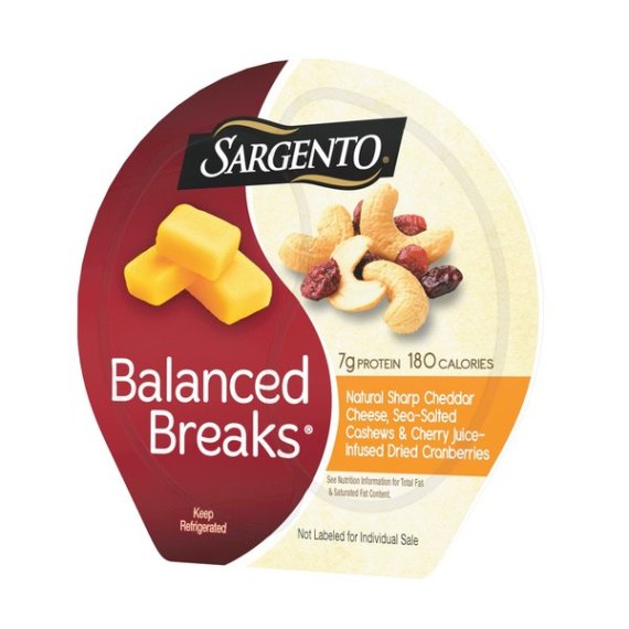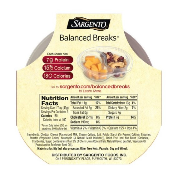 Details Ingredients Cheddar Cheese [Pasteurized Milk, Cheese Culture, Salt, Enzymes, Annatto (Vegetable Color), Natamycin (A Natural Mold Inhibitor)], Dried Fruit and Nut Blend [Cashews, Cranberries, Sugar, contains less than 2% of Cherry Juice Concentrate, Citric Acid, Elderberry Juice Concentrate (Color), Natural Flavor, Sea Salt, Vegetable Oil (Cottonseed, Peanut, Soybean and/or Sunflower)]. Show more Product features To create a loveable snack with real substance, we combined the buttery crunch of sea-salted cashews and the tartness of cherry juice-infused dried cranberries with the rich, bold flavor of Sharp Cheddar. Yum. Convenient individual-sized snack trays come in a 3-count package, each containing less than 200 calories per servings and 7 grams of protein. (See nutrition info for total fat and saturated fat content. Not a low calorie food.) Sargento® Balanced Breaks® snacks combine cheese, fruit and nuts to give you up to 7 grams of protein while staying under 200 calories. (see nutrition info for total fat and saturated fat content. Not a low calorie food) A lovable snack that combines natural Sharp Cheddar cheese, sea-salted, cashews and cherry juice-infused dried cranberries to make snack time your favorite time. Convenient individual-sized snack trays come in a 3-count package, ideal snacking size for the on-the-go person looking for a lift during the day. Sargento® Balanced Breaks® is the perfect pairing for your hunger after the gym, or when you're stuck at your desk at work. Our Family’s Passion Is Cheese™ Net Quantity of Content 3 X 43 g