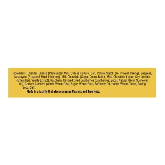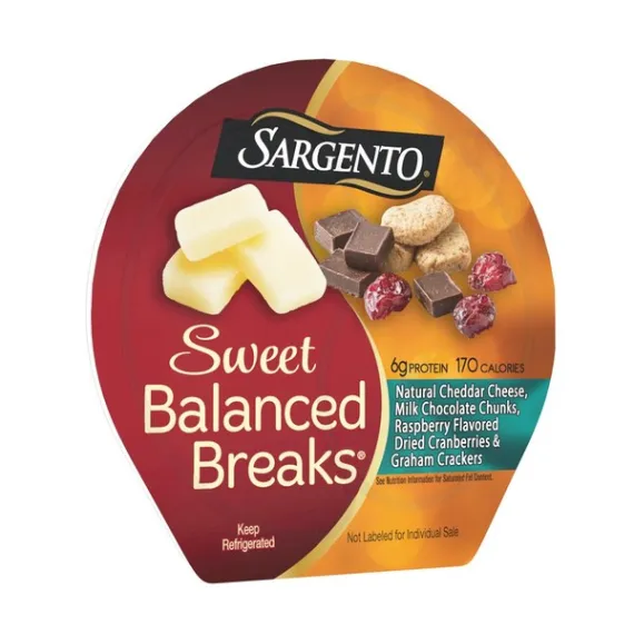 Details Ingredients Cheddar Cheese [Pasteurized Milk, Cheese Culture, Salt, Potato Starch (To Prevent Caking), Enzymes, Natamycin (A Natural Mold Inhibitor)], Milk Chocolate [Sugar, Cocoa Butter, Milk, Chocolate Liquor, Soy Lecithin (Emulsifier), Vanilla Extract], Raspberry Flavored Dried Cranberries (Cranberries, Sugar, Natural Flavor, Sunflower Oil), Graham Crackers (Whole Wheat Flour, Sugar, Wheat Flour, Safflower Oil, Honey, Wheat Gluten, Baking Soda, Salt). Show more Product features Tart and tangy and oh so good. We paired White Cheddar cheese and raspberry-flavored dried cranberries with milk chocolate and graham crackers to create a balanced snack with the sweetness you crave. Convenient individual-sized snack trays come in a 3-count package, each containing less than 200 calories per servings and 6 grams of protein (See nutrition info for total fat and saturated fat content. Not a low calorie food.) This Sargento® Sweet Balanced Breaks® offering combines cheese, dried fruit, chocolate and graham crackers to give you up to 6 grams of protein, under 200 calories, (See nutrition info for total fat and saturated fat content. Not a low calorie food.) Go ahead and answer your cravings. Natural Cheddar cheese with chocolate chunks, raspberry flavored dried cranberries and graham crackers bring you the perfect balance of sweetness and goodness. Convenient Individual-sized snack trays come in a 3-count package, ideal snacking size for any moment that calls for a little indulgence This order includes three 1.5-ounce packs of Sargento Sweet Balanced Breaks® with Natural Cheddar Cheese, Chocolate Chunks, Raspberry Flavored Dried Cranberries and Graham Crackers. Our Family’s Passion Is Cheese™ Net Quantity of Content 3 X 43 g