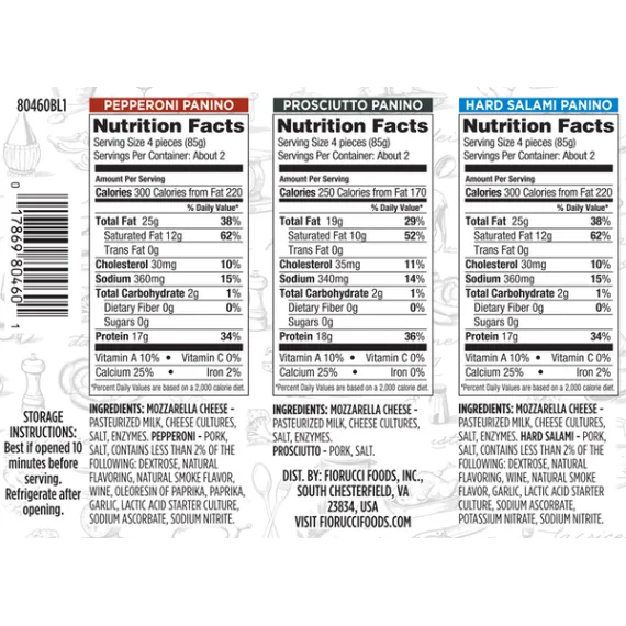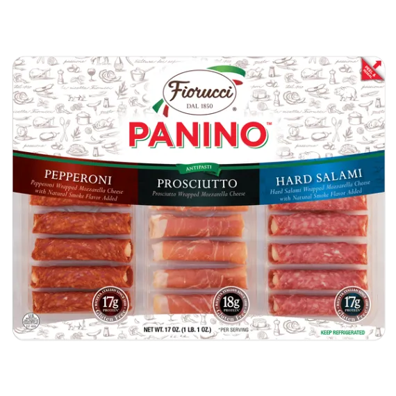 Details Product features Experience the delectable taste of Fiorucci Paninos. Each one features premium cheese and meat made from our authentic Italian recipes. They are a good source of protein and the Italian Style Assortment Party Tray is great for snacks, lunches and entertaining! Visit FiorucciFoods.com for information on all of our products. Prosciutto & Mozzarella Panino: 18 grams of protein per serving Hard Salami & Mozzarella Panino: 17 grams of protein per serving Pepperoni & Mozzarella Panino: 17 grams of protein per serving No artificial flavors, colors or ingredients Good source of calcium Gluten free Resealable package 24 paninos per package 8 paninos of each flavor Serving size: about 4 paninos About 2 servings per container per flavor Just open and serve! Italian recipe since 1850