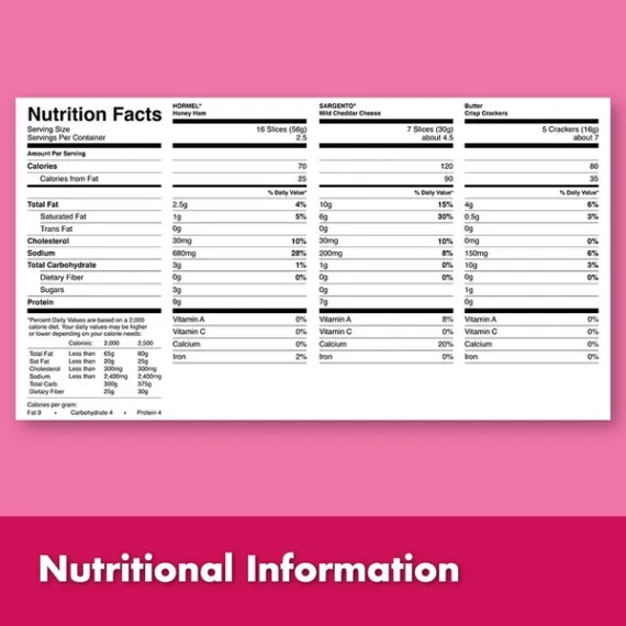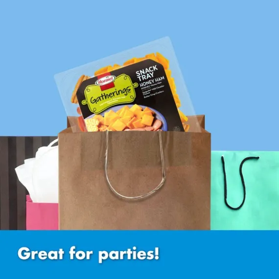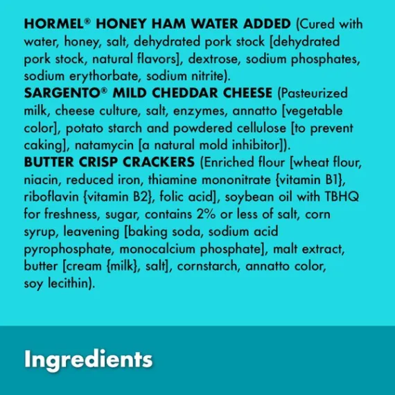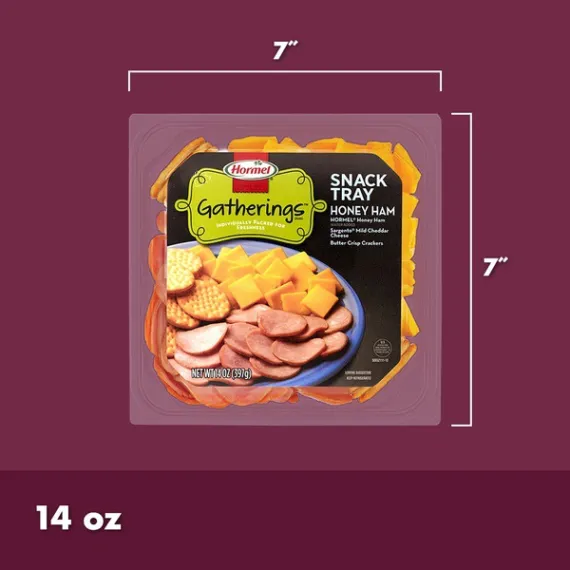Details Ingredients Hormel Honey Ham Water Added (Cured with Water, Honey, Salt, Dehydrated Pork Stock [Dehydrated Pork Stock, Natural Flavors] Dextrose, Sodium Phosphates, Sodium Erythorbate, Sodium Nitrite). Sargento Mild Cheddar Cheese: (Pasteurized Milk, Cheese Culture, Salt, Enzymes, Annatto [Vegetable Color], Potato Starch and Powdered Cellulose [to Prevent Caking], Natamycin [a Natural Mold Inhibitor]). Butter Crisp Crackers (Enriched Flour [Wheat Flour, Niacin, Reduced Iron, Thiamine Mononitrate {Vitamin B1}, Riboflavin {Vitamin B2}, Folic Acid], Soybean Oil with TBHQ for Freshness, Sugar, Contains 2% or Less of Salt, Corn Syrup, Leavening [Baking Soda, Sodium Acid Pyrophosphate, Monocalcium Phosphate] Malt Extract, Butter [Cream {Milk}, Salt], Cornstarch, Annatto Color, Soy Lecithin). Show more Product features Make your gatherings more fun with this Hormel Gatherings Honey Ham Snack Tray 14 Oz. It's large enough to serve about four people and comes with a variety of flavors. This ham and cheese snack pack includes mild cheddar and butter crisp crackers. It's designed to remain fresh and makes a convenient way to entertain your guests. Enjoy this Hormel Gatherings snack tray along with some olives and select beverages for a nice appetizer. HORMEL GATHERINGS is a trademark of HORMEL FOODS, LLC. Hormel Gatherings Honey Ham Snack Tray: ・Hormel honey ham, Sargento mild cheddar cheese and butter crisp crackers ・Packed individually for freshness ・Ham and cheese snack pack serves about 4 ・Quick and easy way to entertain your guests when they come to visit ・Suitable for holiday parties, birthdays and other occasions ・Goes nicely with many other finger foods Special Features QUICK AND EASY: No meal prepping, slicing or dicing. Simply remove the seal and enjoy deliciousness in every bite Net Quantity of Content about 7 X 56.00 g