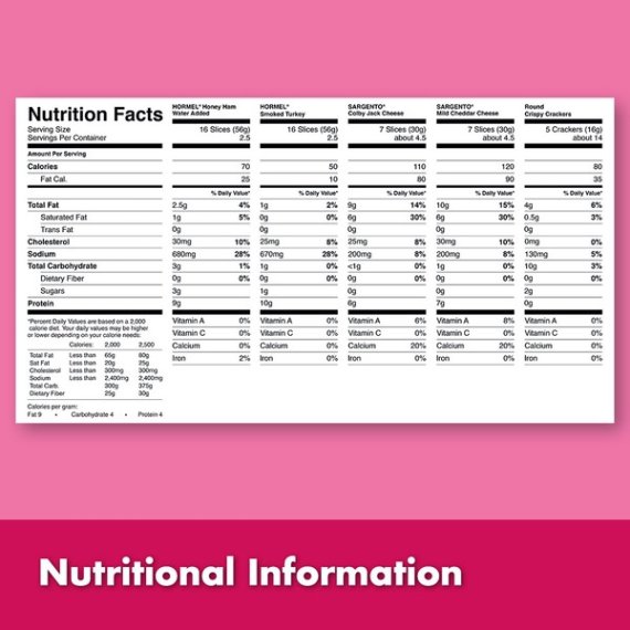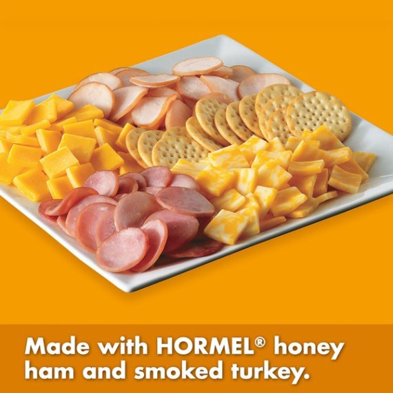 Details Ingredients Crackers (Enriched Flour [Wheat Flour, Niacin, Reduced Iron, Vitamin B1 {Thiamine Mononitrate}, Vitamin B2 {Riboflavin}, Folic Acid], Soybean Oil with TBHQ for Freshness, Sugar, Contains 2% or Less of Salt, Corn Syrup, Leavening [Baking Soda, Sodium Acid Pyrophosphate, Monocalcium Phosphate], Whey [Milk], Soy Lecithin). Hormel Honey Ham Water Added (Cured with Water, Honey, Salt, Dehydrated Pork Stock [Dehydrated Pork Stock, Natural Flavors], Dextrose, Sodium Phosphates, Sodium Erythorbate, Sodium Nitrite). Hormel Smoked Turkey (Turkey Breast, Turkey Broth, Salt, Sugar, Modified Food Starch, Sodium Phosphates, Sodium Ascorbate, Sodium Nitrite, Natural Flavoring). Sargento Colby Jack Cheese (Colby Cheese [Pasteurized Milk, Cheese Culture, Salt, Enzymes, Annatto {Vegetable Color}], Monterey Jack Cheese [Pasteurized Milk, Cheese Cultures, Salt, Enzymes], Potato Starch and Powdered Cellulose [to Prevent Caking], Natamycin [a Natural Mold Inhibitor]). Sargento Mild Cheddar Cheese (Pasteurized Milk, Cheese Culture, Salt, Enzymes, Annatto [Vegetable Color], Potato Starch and Powdered Cellulose [to Prevent Caking], Natamycin [a Natural Mold Inhibitor]). Show more Product features Bring the party snack and dont forget the tray. HORMEL GATHERINGS Honey Ham and Turkey Party Tray is an instant winner at any party or event. With sweet sliced HORMEL Honey Ham and Turkey, and SARGENTO Colby Jack and Cheddar Cheese, guests can sandwich the two premium foods between buttery crisp crackers for a classic appetizer. The bite-sized portions are perfect to share with friends, colleagues or family and great for any meal or snack. HORMEL GATHERINGS is a trademark of HORMEL FOODS, LLC. PARTY STARTER: Complete the party with the HORMEL Turkey and Cheese Party Tray; bring the appetizer all guests will be grateful for SOMETHING FOR EVERYONE: With a variety of stackable, mixable options, guests can create personal combinations of meat, cheese and crackers PREMIUM INGREDIENTS: Exceptional ingredients meet superior flavors. Premium cuts of turkey and ham and flavorful cheese are individually pre-sliced CROWD-PLEASER: Whether an afternoon snack at a play date or appetizer at an event, the party tray is kid-friendly and loved by adults for any occasion CONVENIENCE: Asked to bring food to a party? Hosting a flash event? The ease and convenience the party tray provides is unapparelled Special Features PARTY STARTER: Complete the party with the HORMEL Turkey and Cheese Party Tray; bring the appetizer all guests will be grateful for Net Quantity of Content 2.5 X 56.00 g