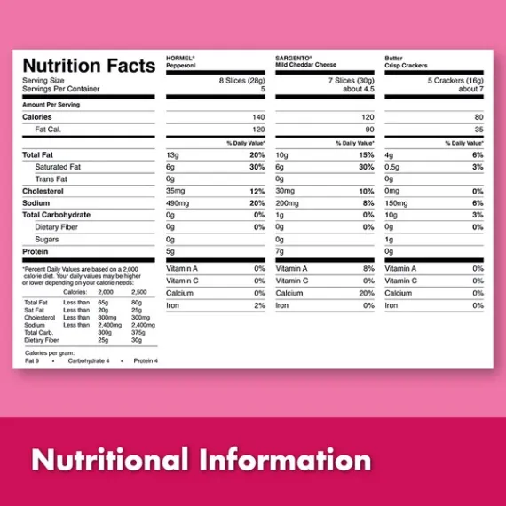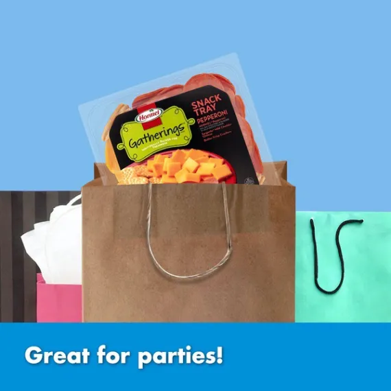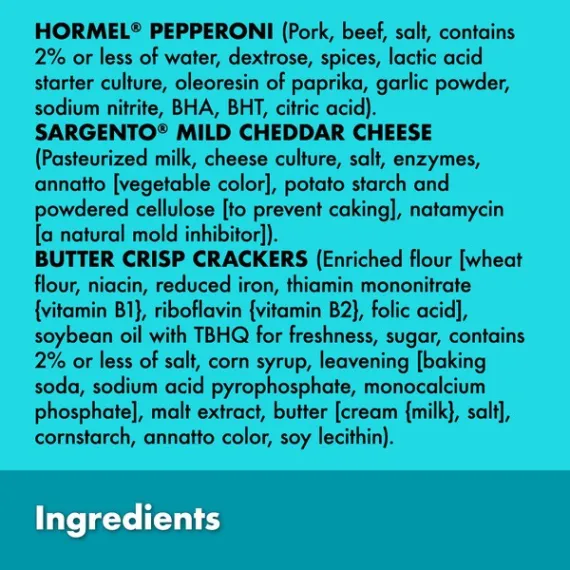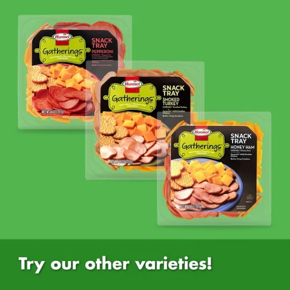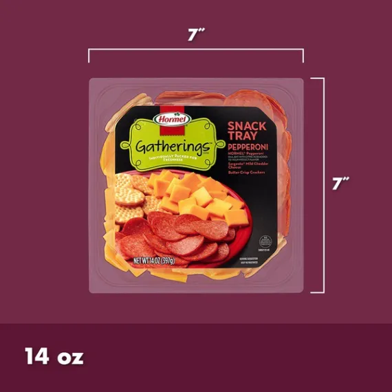 Details Ingredients For Pepperoni: BHA, BHT with Citric Acid Added to Help Protect Flavor. Ingredients: HORMEL® Pepperoni (Pork, Beef, Salt, Contains 2% or less of Water, Dextrose, Spices, Lactic Acid Starter Culture, Oleoresin of Paprika, Garlic Powder, Sodium Nitrite, BHA, BHT, Citric Acid), SARGENTO® Mild Cheddar Cheese (Pasteurized Milk, Cheese Culture, Salt, Enzymes, Annatto [Vegetable Color], Potato Starch and Powdered Cellulose [to prevent caking], Natamycin [a Natural Mold Inhibitor]), Buttercrisp Crackers (Enriched Flour [Wheat Flour, Niacin, Reduced Iron, Thiamine Mononitrate {Vitamin B1}, Riboflavin {Vitamin B2}, Folic Acid], Soybean Oil with TBHQ for freshness, Sugar, Contains 2% or less of Salt, Corn Syrup, Leavening [Baking Soda, Sodium Acid Pyrophosphate, Monocalcium Phosphate], Malt Extract, Butter [Cream {Milk}, Salt], Cornstarch, Annatto Color, Soy Lecithin). Show more Product features Premium ingredients of pepperoni, cheddar cheese and buttery crackers create HORMEL GATHERINGS Pepperoni and Cheese Snack Tray. With 14-ounces of hearty texture and generous flavors, the snack tray is a crowd-pleaser everyone will love. This after school snack, or office indulgence, is easy to pack and convenient to serve. The snack tray is not only kid-friendly, it is enjoyed by all for quick protein and the perfect bite-sized portions. HORMEL GATHERINGS is a trademark of HORMEL FOODS, LLC. NO HASSLE SNACK: Simply tear off the top and devour; with such little preparation, this snack is quick to serve and easy share TRAVELS WELL: Whether at work, travelling between kids activities or on the road, this snack tray is accessible and effortless HEARTY YET SMOOTH: Strong, spicy pepperoni flavor meets the smooth, dense texture of mild cheddar cheese on top of rich, buttery, crisp crackers TRUE FAMILY CONVENIENCE: Grab out of the fridge for a perfect serving size snack the whole family will enjoy STACKABLE COMBOS: Pepperoni on cheese on crackers, meat and cheese sandwiched between crackers; whatever the combo, deliciousness is served Special Features NO HASSLE SNACK: Simply tear off the top and devour; with such little preparation, this snack is quick to serve and easy share Net Quantity of Content about 4.5 X 28.00 g