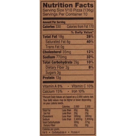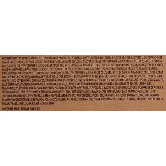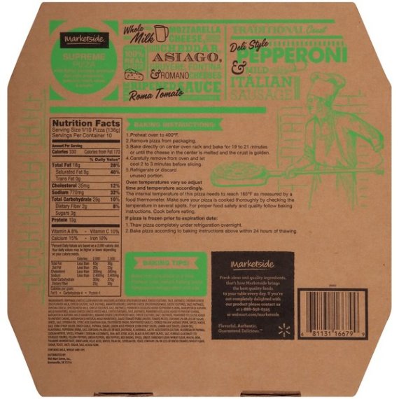 Details Ingredients Toppings: Cheeses (Low Moisture Mozzarella Cheese [Pasteurized Milk, Cheese Cultures, Salt, Enzymes], Cheddar Cheese [Pasteurized Milk, Cheese Cultures, Salt, Enzymes, Annatto (Color)], Gruyere Cheese [Pasteurized Milk, Cheese Cultures, Salt, Enzymes], Fontina Cheese [Pasteurized Milk, Cheese Cultures, Salt, Enzymes, Powdered Cellulose Added to Prevent Caking, Natamycin {a Natural Mold Inhibitor}], Asiago Cheese [Pasteurized Milk, Cheese Cultures, Salt, Enzymes, Powdered Cellulose Added to Prevent Caking, Natamycin {a Natural Mold Inhibitor}], Romano Cheese [Pasteurized Milk, Cheese Cultures, Salt, Enzymes, Powdered Cellulose Added to Prevent Caking, Natamycin {a Natural Mold Inhibitor}]), Sauce (Tomato Puree [Water, Tomato Paste], Contains 2% or Less of Sugar, Spices, Salt, Soybean Oil, Citric Acid, Xanthan Gum, Dehydrated Onion, Dehydrated Garlic), Cooked Italian Sausage (Pork, Spices, Water, Salt, Corn Syrup Solids, Dried Garlic, Paprika, Sugar, Lemon Juice Powder [Corn Syrup Solids, Lemon Juice Solids, Lemon Oil], Flavoring), Pepperoni (Pork, Salt, Contains 2% or Less of Beef, Dextrose, Flavorings, Lactic Acid Starter Culture, Oleoresin of Paprika, Sodium Nitrite, Spices, Vitamin C [Sodium Ascorbate], BHA, BHT, Citric Acid), Black Olives (Ripe Olives, Salt, Ferrous Gluconate to Stabilize Color), Yellow Peppers, Green Peppers, Red Peppers, Red Onions, Spices, Crust: Enriched Wheat Flour (Flour, Niacin, Iron, Thiamine Mononitrate, Riboflavin, Folic Acid), Water, Palm Oil, Soybean Oil, Yeast, Contains 2% or Less of Bread Crumbs (Wheat Flour, Sugar, Yeast, Salt), Sugar, Salt, Acacia Gum. Show more Product features Marketside Supreme Pizza starts with a crispy traditional style crust that is loaded with a delicious blend of whole milk mozzarella, asiago, gruyere, fontina, Romano and cheddar cheeses, vine-ripened roma tomato sauce, fresh basil, premium deli-style pepperoni, mild Italian sausage, and a crisp mix of peppers, black olives and onions. Our pizzas are crafted with care, using just the right combination of flavorful and wholesome ingredients. Make it a meal and serve with Caesar salad and garlic knots. This pizza also offers nutritional benefits as it is an excellent source of calcium and protein. Simply bake for 19 to 21 minutes to enjoy great tasting, restaurant quality pizza right in the comfort of your own home. Fresh ideas and quality ingredients, that's how Marketside brings the best foods to your table. We are committed to deliver freshness that you can taste and see. Marketside offers the best in fresh food, guaranteed by Walmart, working in partnership with farmers, bakers and chefs for the highest quality, authentic ingredients and favorite recipes. Baking Instructions: Preheat oven to 400°F. Remove pizza from packaging. Bake directly on center oven rack and bake for 19 to 21 minutes. Carefully remove from oven and let cool 2 to 3 minutes before slicing. Refrigerate or discard unused portion. Marketside Traditional Crust Supreme Pizza, Extra Large, 48.2 oz: Take and bake Made with whole milk mozzarella, asiago, gruyere, fontina, Romano and cheddar cheeses, vine-ripened roma tomato sauce, fresh basil, deli sliced pepperoni, mild Italian sausage, peppers, black olives and onions USDA inspected Heats in 19-21 minutes 10 servings per container Net weight 48.2 oz Net Quantity of Content 10 X 1/10 Pizza (136g)