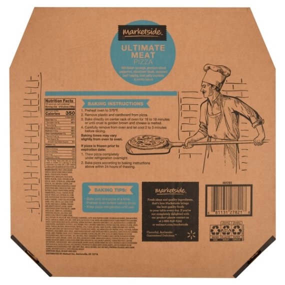 Details Ingredients CRUST (UNBLEACHED ENRICHED WHEAT FLOUR [WHEAT FLOUR, NIACIN, REDUCED IRON, THIAMINE MONONITRATE, RIBOFLAVIN, FOLIC ACID], WATER, PALM OIL, YEAST, CONTAINS 2% OR LESS OF: SUGAR, SOYBEAN OIL, EXTRAVIRGIN OLIVE OIL, SALT, NATURAL FLAVOR), LOW MOISTURE WHOLE MILK MOZZARELLA CHEESE (PASTEURIZED MILK, CHEESE CULTURES, SALT, ENZYMES), SAUCE (TOMATO PUREE [WATER, TOMATO PASTE], SUGAR, CONTAINS 2% OR LESS OF: SPICES, SALT, SOYBEAN OIL, CITRIC ACID, XANTHAN GUM, DEHYDRATED ONION, GARLIC POWDER), COOKED ITALIAN SAUSAGE (PORK, SPICES, WATER, SALT, CORN SYRUP SOLIDS, DRIED GARLIC, PAPRIKA, PAPRIKA AND ANNATTO EXTRACT, SUGAR, LEMON JUICE POWDER [CORN SYRUP SOLIDS, LEMON JUICE SOLIDS, LEMON OIL], FLAVORING), PEPPERONI, BHA, BHT, AND CITRIC ACID ADDED TO HELP PROTECT FLAVOR (PORK, SALT, CONTAINS 2% OR LESS OF: BEEF, DEXTROSE, FLAVORINGS, LACTIC ACID STARTER CULTURE, OLEORESIN OF PAPRIKA, SODIUM NITRITE, SPICES, SODIUM ASCORBATE, BHA, BHT, CITRIC ACID), SLICED BEEF STEAK, WATER AND MODIFIED FOOD STARCH PRODUCT WITH NATURAL SMOKE FLAVOR ADDED (BEEF, WATER, DEXTROSE, SODIUM PHOSPHATE, MODIFIED CORNSTARCH, SALT, AUTOLYZED YEAST, HYDROLYZED CORN PROTEIN. COATEDWITH: DEXTROSE, SALT, SODIUM CITRATE, MODIFIED CORNSTARCH, SODIUM DIACETATE, NATURAL FLAVOR, SPICES, GARLIC POWDER, MUSTARD, ONIONPOWDER, PAPRIKA, GRILL FLAVOR, NATURAL SMOKE FLAVOR), COOKED SEASONED BEEF TOPPING, BHA, BHT, AND CITRIC ACID ADDED TO HELP PROTECT FLAVOR (BEEF, WATER, SALT, HYDROLYZED SOY PROTEIN, SPICES, DEXTROSE, SODIUM PHOSPHATE, DRIED ONION, DRIED GARLIC, DRIEDWORCESTERSHIRE SAUCE [DISTILLED VINEGAR, MOLASSES, CORN SYRUP, SALT, CARAMEL COLOR, GARLIC POWDER, SUGAR, SPICES, TAMARIND, NATURAL FLAVOR], BHA, BHT, CITRIC ACID), NO SMOKE PROVOLONE CHEESE (PASTEURIZED MILK, CHEESE CULTURES, SALT, ENZYMES), FULLY COOKED BEEF PATTY CRUMBLES (BEEF, WATER, TEXTURED VEGETABLE PROTEIN [SOY FLOUR, CARAMEL COLOR], SALT, SPICE, GRANULATED ONION, GRANULATED GARLIC), CONTAINS 2% OR LESS OF: FULLY COOKED BACON BITS SMOKE FLAVOR ADDED (PORK CURED WITH WATER, SALT, SMOKE FLAVORING, SODIUM PHOSPHATE, SODIUM ERYTHORBATE, SODIUM NITRITE. MAY CONTAIN SUGAR, BROWN SUGAR), GRATED PARMESAN CHEESE (PARMESAN CHEESE [PASTEURIZED PART-SKIM MILK, CHEESE CULTURES, SALT, ENZYMES], POWDERED CELLULOSE [ANTI-CAKING AGENT]), GRATED ROMANO CHEESE (ROMANO CHEESE [PASTEURIZED PART-SKIM COW'S MILK, CHEESE CULTURES, SALT, ENZYMES], POWDERED CELLULOSE [ANTI-CAKING AGENT), DEHYDRATED GARLIC, DRIED OREGANO, PARSLEY. Show more Product features Marketside Meat Ultimate Meat Pizza starts with a delicious traditional crust that is loaded with over one pound of toppings. This pizza is a meat lovers dream as it is topped with Italian sausage, premium sliced pepperoni, sliced beef steak, seasoning beef topping, beef patty crumbles and smoky bacon. It also features a blend of delicious blend of whole milk mozzarella, parmesan, provolone, and Romano cheese, vine-ripened roma tomato sauce and fresh basil. Our pizzas are crafted with care, using just the right combination of flavorful and wholesome ingredients. Serve it with a fresh Caesar salad, garlic knots or a hot cup of vegetable soup. This pizza is an excellent source of calcium and protein and is USDA inspected. Simply bake for 16 to 18 minutes and enjoy great tasting, restaurant quality pizza right in the comfort of your own home. Treat yourself to a bite of Marketside Ultimate Meat Pizza. Fresh ideas and quality ingredients, that's how Marketside brings the best foods to your table. We are committed to deliver freshness that you can taste and see. Marketside offers the best in fresh food, guaranteed by Walmart, working in partnership with farmers, bakers and chefs for the highest quality, authentic ingredients and favorite recipes. BAKING INSTRUCTIONS Preheat oven to 375°F. Remove pizza from packaging. Bake directly on center rack of oven for 16 to 18 minutes. Carefully remove from oven and let cool 2 to 3 minutes before slicing. Baking time may vary slightly from oven to oven. Marketside Traditional Crust Ultimate Meat Pizza, Extra Large, 54.2 oz: Over 1 pound of toppings Italian sausage, premium sliced pepperoni, sliced beef steak, seasoning beef topping, beef patty crumbles and smoky bacon Topped with a delicious blend of whole milk mozzarella, asiago, parmesan, provolone, and Romano cheese USDA Inspected Traditional Crust Easy to bake Take and bake Net Quantity of Content 12 X 1/2 pizza (128g)