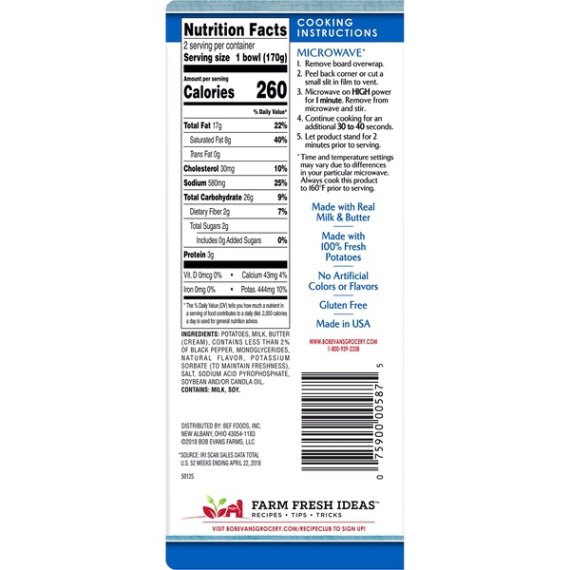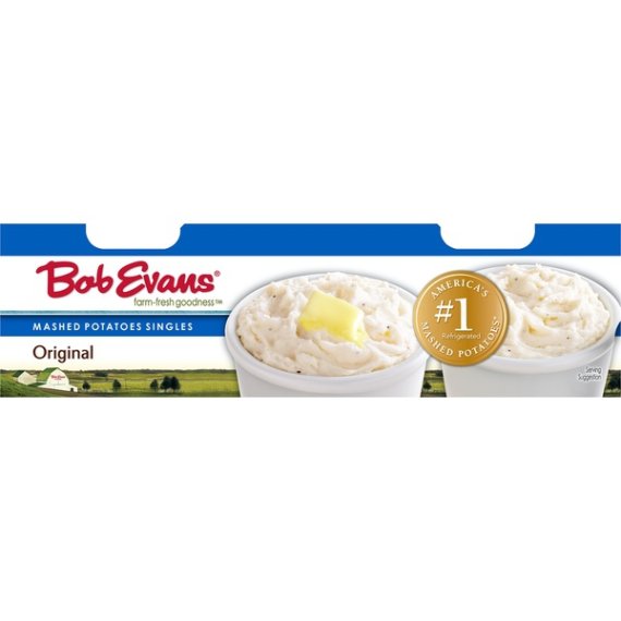 Details Ingredients POTATOES, MILK, BUTTER (CREAM, SALT), MARGARINE (SOYBEAN OIL, WATER, SALT, WHEY SOLIDS, HYDROGENATED COTTONSEED OIL, VEGETABLE MONO AND DIGLYCERIDES, SOY LECITHIN, SODIUM BENZOATE [PRESERVATIVE], CITRIC ACID, ARTIFICIAL FLAVOR, VITAMIN A PALMITATE, DIACETYL TARTARIC ACID OF ESTER OF MONO AND DIGLYCERIDES, CALCIUM SILICATE [ANTICAKING AGENT]), PRESERVATIVE (ARTIFICIAL COLOR, POTASSIUM SORBATE, SALT, AND SOYBEAN OIL), SODIUM ACID PYROPHOSPHATE, SPICE. Show more Product features Mashed Potatoes, Original, 2 Pack, Sleeve 6 OZ 2 single servings. Made with real milk & butter. Made with 100% fresh potatoes. No artificial colors or flavors. Gluten free. Farm-fresh goodness. America's No. 1 refrigerated mashed potatoes (Source: IRI scan scales data total U.S. 52 weeks ending July 10, 2016). Microwavable. Ready to heat & eat. Bob Evans Farm-Fresh Goodness Pledge: Bob Evans opened his first sausage shop near his Ohio farm in 1948. He used the finest ingredients and set a standard of excellence. To this day, with over 500 restaurants and more than 100 grocery products, the Bob Evans brand lives up to the standard started over 60 years ago. If you are not completely satisfied, please contact us for a replacement or refund. For more information, please visit www.bobevans.com/guarantee. Bob Evans - 1918-2007. www.Bobevans.com. Keep refrigerated. Microwave (Time and temperature settings may vary due to differences in your particular stove or microwave. Always cook this product to 160 degrees F prior to serving). 1. Remove board overwrap. 2. Peel back corner or cut a small slit in film to vent. 3. Microwave on high power for 1 minute. Remove from microwave and stir. 4. Continue cooking for an additional 30 to 40 seconds. 5. Let product stand for 2 minutes prior to serving. Contains: milk, soy. 2 servings [12 oz (340 g)] New Albany, OH 43054-1183 800-939-2338 2016 Bob Evans Farms, LLC Mashed Potatoes, Singles 2 single servings. Made with real milk & butter. Made with 100% fresh potatoes. No artificial colors or flavors. Gluten free. Farm-fresh goodness. America's No. 1 refrigerated mashed potatoes (Source: IRI scan scales data total U.S. 52 weeks ending July 10, 2016). Microwavable. Ready to heat & eat. Bob Evans Farm-Fresh Goodness Pledge: Bob Evans opened his first sausage shop near his Ohio farm in 1948. He used the finest ingredients and set a standard of excellence. To this day, with over 500 restaurants and more than 100 grocery products, the Bob Evans brand lives up to the standard started over 60 years ago. If you are not completely satisfied, please contact us for a replacement or refund. For more information, please visit www.bobevans.com/guarantee. Bob Evans - 1918-2007. www.Bobevans.com. Special Features Microwaveable Net Quantity of Content 2 X 170 g