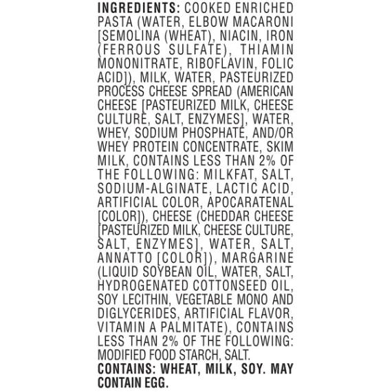 Details Ingredients COOKED ENRICHED PASTA (WATER, ELBOW MCRONI [SEMOLINA (WHEAT), NIACIN, IRON (FERROUS SULFATE), THIAMIN MONONITRATE, RIBOFLAVIN, FOLIC ACID]), MILK, WATER, PASTEURIZED MILK, CHEESE CULTURE, SALT, ENZYMES], WATER, WHEY, SODIUM PHOSPHATE, AND/OR WHEY PROTEIN CONCENTRATE, SKIM MILK, CONTAINS LESS THAN 2% OF THE FOLLOWING: MILKFAT, SALT, SODIUM-ALGINATE, LACTIC ACID, ARTIFICAL COLOR, APOCARTENAL [COLOR]), CHEESE (CHEDDAR CHEESE [PASTEURIZED MILK, CHEESE CULTURE, SALT, ENZYMES], WATER, SALT, ANNATTO [COLOR]), MARGARINE (LIQUID SOYBEAN OIL, WATER, SALT, HYDROGENATED COTTONSEED OIL, SOY LECITHIN, VEGETABLE MONO AND DIGLYCERIDES, ARTIFICAL FLAVOR, VITAMIN A PALMITATE), CONTAINS LESS THAN 2% OF THE FOLLOWING: MODIFIED FOOD STARCH, SALT. Show more Product features Macaroni & Cheese, Tasteful Sides, Sleeve 20 OZ Serves 2. Made with real cheddar cheese. No artificial preservatives. Good source of calcium. Farm-fresh goodness. American's No. 1 refrigerated macaroni & cheese (Source: IRI scan scales data total U.S. 52 weeks ending July 10, 2016). Microwaveable. Farm Fresh Ideas: Recipes, tips, tricks. Visit Bobevans.com/recipeclub to sign up! www.Bobevans.com. Bob Evans Farm-Fresh Goodness Pledge: Bob Evans opened his first sausage shop near his Ohio farm in 1948. He used the finest ingredients and set a standard of excellence. To this day, with over 500 restaurants and more than 100 grocery products, the Bob Evans brand lives up to the standard started over 60 years ago. If you are not completely satisfied, please contact us for a replacement or refund. For more information, please visit www.bobevans.com/guarantee. Bob Evans - 1918-2007. Keep refrigerated. Cooking Instructions: Microwave (Time and temperature settings may vary due to differences in your particular stove or microwave. Always cook this product to 160 degrees F prior to serving): 1. Remove board overwrap. 2. Peel back corner or cut a small slit in film to vent. 3. Microwave on high power for 3 minutes. 4. Carefully remove from microwave, pull back film, and stir. 5. Continue cooking for an additional 1-1/2 to 2-1/2 minutes. 6. Carefully remove from microwave and stir. 7. Let product stand for 2 minutes prior to serving. Stove Top (Time and temperature settings may vary due to differences in your particular stove or microwave. Always cook this product to 160 degrees F prior to serving): 1. Remove board overwrap and film. 2. Empty contents of tray into sauce pan. 3. Place on stove top over medium-low heat, stirring frequently until hot. 4. Carefully remove from cooktop and serve. Contains: wheat, milk, soy. May contain egg. 20 oz (1 lb 4 oz) 567 g New Albany, OH 43054-1183 800-939-2338 2016 Bob Evans Farms, LLC Macaroni & Cheese Serves 2. Made with real cheddar cheese. No artificial preservatives. Good source of calcium. Farm-fresh goodness. American's No. 1 refrigerated macaroni & cheese (Source: IRI scan scales data total U.S. 52 weeks ending July 10, 2016). Microwaveable. Farm Fresh Ideas: Recipes, tips, tricks. Visit Bobevans.com/recipeclub to sign up! www.Bobevans.com. Bob Evans Farm-Fresh Goodness Pledge: Bob Evans opened his first sausage shop near his Ohio farm in 1948. He used the finest ingredients and set a standard of excellence. To this day, with over 500 restaurants and more than 100 grocery products, the Bob Evans brand lives up to the standard started over 60 years ago. If you are not completely satisfied, please contact us for a replacement or refund. For more information, please visit www.bobevans.com/guarantee. Bob Evans - 1918-2007. Net Quantity of Content ABOUT 2 X 1 cup