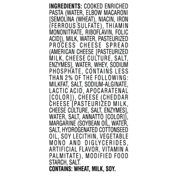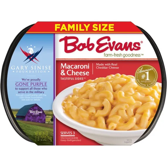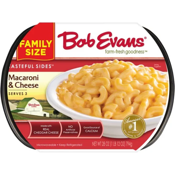 Details Ingredients COOKED ENRICHED PASTA (WATER, ELBOW MACARONI [SEMOLINA (WHEAT), NIACIN, IRON (FERROUS SULFATE), THIAMIN MONONITRATE, RIBOFLAVIN, FOLIC ACID]), MILK, WATER, PASTEURIZED PROCESS CHEESE SPREAD (AMERICAN CHEESE [PASTEURIZED MILK, CHEESE CULTURE, SALT, ENZYMES], WATER, WHEY, SODIUM PHOSPHATE, WHEY PROTEIN CONCENTRATE, SKIM MILK, CONTAINS LESS THAN 2% OF THE FOLLOWING: MILKFAT, SALT, SODIUM-ALGINATE, LACTIC ACID, ARTIFICIAL COLOR, APOCAROTENAL [COLOR]), CHEESE (CHEDDAR CHEESE [PASTEURIZED MILK, CHEESE CULTURE, SALT, ENZYMES], WATER, SALT, ANNATTO [COLOR]), MARGARINE (LIQUID SOYBEAN OIL, WATER, SALT, HYDROGENATED COTTONSEED OIL, SOY LECITHIN, VEGETABLE MONO AND DIGLYCERIDES, ARTIFICIAL FLAVOR, VITAMIN A PALMITATE), CONTAINS LESS THAN 2% OF THE FOLLOWING: MODIFIED FOOD STARCH, SALT. Show more Product features Macaroni & Cheese, Tasteful Sides, Family Size, Tub 28 OZ Farm-fresh goodness. We've gone purple for our military. See side panel for more details. Made with real cheddar cheese. America's no. 1 refrigerated macaroni & cheese (Source: IRI Scan sales data total US 52 weeks.). Serves 3. Microwaveable. Farm fresh ideas. Recipes. Tips. Tricks. Visit Bobevansgrocery.com/recipeclub to sign up! Made with real cheddar cheese. No artificial preservatives. Good source of calcium. www.Bobevansgrocery.com. Our farm salutes all who serve. We love our military and we know you do too. That's why we've gone purple (A color that in the military world represents all who serve), and are continuing our commitment to honoring and serving our military heroes, their families and communities who sacrifice so much. To learn more and to find out how you can get involved, visit www.ourfarmsalutes.com. Facebook. Twitter. (hashtag)ourfarmsalutes. Keep refrigerated. Cooking Instructions: Microwave (Time and temperature settings may vary due to differences in your particular stove or microwave. Always cook this product to 160 degrees F prior to serving.): 1. Remove board overwrap. 2. Peel back corner or cut a small slit in film to vent. 3. Microwave on high power for 4 minutes. 4. Carefully remove from microwave, pull back film, and stir. 5. Continue cooking for an additional 2-1/2 to 3-1/2 minutes. 6. Carefully remove from microwave and stir. 7. Let product stand for 2 minutes prior to serving. Stove Top (Time and temperature settings may vary due to differences in your particular stove or microwave. Always cook this product to 160 degrees F prior to serving.): 1. Remove board overwrap and film. 2. Empty contents of tray into sauce pan. 3. Place on stove top over medium-low heat, stirring frequently until hot. 4. Carefully remove from cooktop and serve. Contains: wheat, milk, soy. 28 oz (1 lb 12 oz) 794 g New Albany, OH 43054-1183 800-939-2338 2017 Bob Evans Farms, LLC Macaroni & Cheese, Family Size Farm-fresh goodness. We've gone purple for our military. See side panel for more details. Made with real cheddar cheese. America's no. 1 refrigerated macaroni & cheese (Source: IRI Scan sales data total US 52 weeks.). Serves 3. Microwaveable. Farm fresh ideas. Recipes. Tips. Tricks. Visit Bobevansgrocery.com/recipeclub to sign up! Made with real cheddar cheese. No artificial preservatives. Good source of calcium. www.Bobevansgrocery.com. Our farm salutes all who serve. We love our military and we know you do too. That's why we've gone purple (A color that in the military world represents all who serve), and are continuing our commitment to honoring and serving our military heroes, their families and communities who sacrifice so much. To learn more and to find out how you can get involved, visit www.ourfarmsalutes.com. Facebook. Twitter. (hashtag)ourfarmsalutes. Net Quantity of Content ABOUT 3 X 1 cup