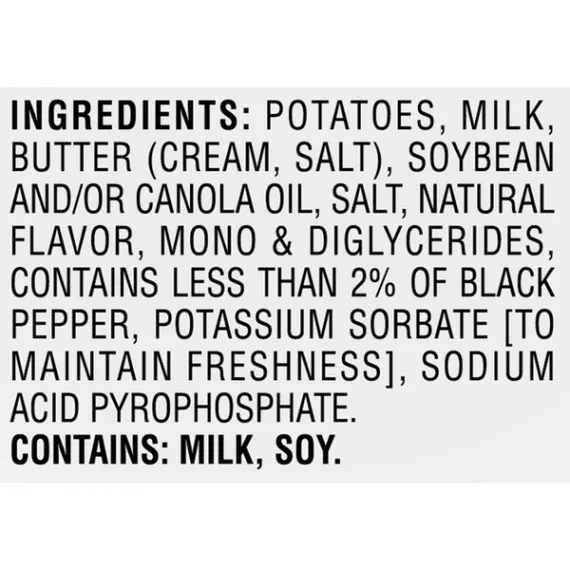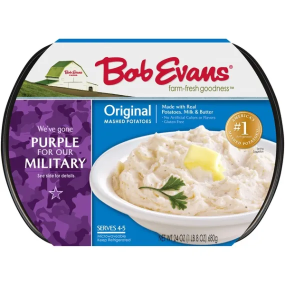 Details Ingredients POTATOES, MILK, BUTTER (CREAM, SALT), MARGARINE (SOYBEAN OIL, WATER, SALT, WHEY SOLIDS, HYDROGENATED COTTONSEED OIL, VEGETABLE MONO AND DIGLYCERIDES, SOY LECITHIN, SODIUM BENZOATE [PRESERVATIVE], CITRIC ACID, ARTIFICIAL FLAVOR, VITAMIN A PALMITATE, DIACETYL TARTARIC ACID OF ESTER OF MONO AND DIGLYCERIDES, CALCIUM SILICATE [ANTICAKING AGENT]), PRESERVATIVE (ARTIFICIAL COLOR, POTASSIUM SORBATE, SALT, AND SOYBEAN OIL), SODIUM ACID PYROPHOSPHATE, SPICE. Show more Product features Create quick and tasty meals with Bob Evans Frozen Mashed Potatoes. They're made with farm-fresh ingredients and don't contain gluten or artificial colors or flavors. These original mashed potatoes are easy to prepare on the stove or in the microwave. Made with real milk and butter, they have a delicious flavor and creamy texture. Bob Evans Original Mashed Potatoes: Made with real potatoes, milk and butter Serves 4 to 5 Cook in a microwave or on a stove Farm-fresh goodness America's #1 refrigerated mashed potatoes No artificial colors or flavors Gluten-free Package contains 24 oz of refrigerated mashed potatoes Net Quantity of Content ABOUT 5 X 0.5 cup