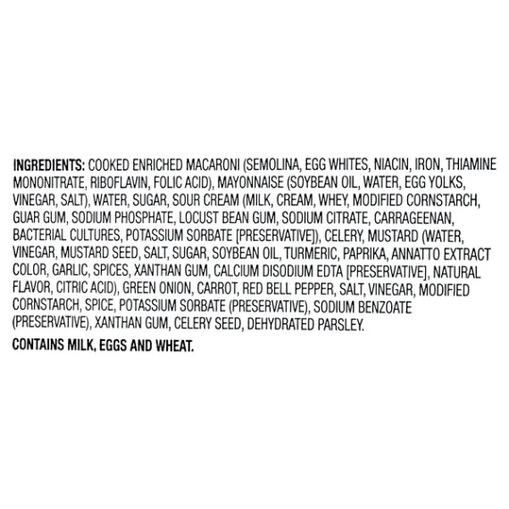 Details Ingredients Cooked Enriched Macaroni (Semolina, Egg Whites, Niacin, Iron, Thiamine Mononitrate, Riboflavin, Folic Acid), Mayonnaise (Soybean Oil, Water, Egg Yolks, Vinegar, Salt), Water, Sugar, Sour Cream (Milk, Cream, Whey, Modified Cornstarch, Guar Gum, Sodium Phosphate, Locust Bean Gum, Sodium Citrate, Carrageenan, Bacterial Cultures, Potassium Sorbate (Preservative)), Celery, Mustard (Water, Vinegar, Mustard Seed, Salt, Sugar, Soybean Oil, Turmeric, Paprika, Annatto Extract Color, Garlic, Spices, Xanthan Gum, Calcium Disodium EDTA (Preservative), Natural Fiavor, Citric Acid), Green Onion, Carrot, Red Bell Pepper, Salt, Vinegar, Modified Cornstarch, Spice, Potassium Sorbate (Preservative), Sodium Benzoate (Preservative), Xanthan Gum, Celery Seed, Dehydrated Parsley. Show more Product features Walmart Deli Macaroni Salad is made with made with our home-style recipe which gives this delicious side a smooth and creamy taste that your family is sure to enjoy. This tasty favorite is the perfect side dish for any hearty meal. Serve it with crispy chicken strips and green beans for a classically delicious meal. It is great for health conscious individuals as it is made with no artificial flavors or high fructose corn syrup. This salad also offers nutritional benefits as it is a good source of dietary vitamin A and iron. It comes ready to serve and contains three servings for your convenience. Wholesome dinner sides are made easy with Walmart Deli Macaroni Salad. Walmart Deli Macaroni Salad: Always fresh No artificial flavors or high fructose corn syrup Dinner side dish Ready to serve 3 servings per container Net weight 1 lb Net Quantity of Content ABOUT 3 X 3/4 cup
