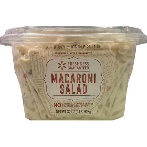 Details Ingredients Cooked Enriched Macaroni (Semolina, Egg Whites, Niacin, Iron, Thiamine Mononitrate, Riboflavin, Folic Acid), Mayonnaise (Soybean Oil, Water, Egg Yolks, Vinegar, Salt), Water, Sugar, Sour Cream (Milk, Cream, Whey, Modified Cornstarch, Guar Gum Sodium Phosphate, Locust Bean Gum, Sodium Citrate, Carrageenan, Bacterial Cultures, Potassium Sorbate (Preservative)), Celery Mustard (Water, Vinegar, Mustard Seed, Salt, Sugar, Soybean Oil, Turmeric, Paprika, Annatto Extract Color, Garlic, Spices, Xanthan Gum, Calcium Disodium EDTA (Preservative), Natural Flavor, Citric Acid), Green Onion, Carrot, Red Bell Pepper, Salt, Vinegar, Modified Cornstarch, Spice, Potassium Sorbate (Preservative), Sodium Benzoate (Preservative), Xanthan Gum, Celery Seed, Dehydrated Parsley. Show more Product features Walmart Deli Macaroni Salad is made with made with our home-style recipe which gives this delicious side a smooth and creamy taste that your family and friends are sure to enjoy. This tasty favorite is the perfect side dish for any hearty meal. Serve it with crispy chicken strips and green beans for a classically delicious meal. It is great for health conscious individuals as it is made with no artificial flavors or high fructose corn syrup. This salad also offers nutritional benefits as it is a good source of vitamin A and iron. It comes ready to serve for your convenience and contains six servings, making it easy to feed a crowd. Wholesome dinner sides are made easy with Walmart Deli Macaroni Salad. Walmart Deli Macaroni Salad: Always fresh No artificial flavors or high fructose corn syrup Dinner side dish Ready to serve 6 servings per container Net weight 2 lb Net Quantity of Content ABOUT 6 X 3/4 cup