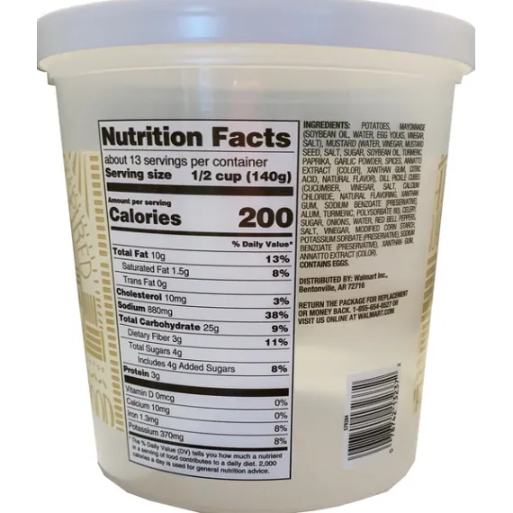 Details Ingredients Potatoes, Mayonnaise (Soybean Oil Water, Egg Yolks, Vinegar, Salt), Mustard (Water Vinegar, Mustard Seed, Salt, Sugar, Soybean Oil Turmeric, Paprika, Annatto Color, Garlic Spices, Xanthan Gum, Calcium Disodium EDTA (Preservative), Natural Flavor, Citric Acid), Dill Pickle Relish (Cucumbers, Distilled Vinegar, Salt, Contains Less Than 2% Of: Xanthan Gum, Sodium Benzoate (Preservative), Aluminum Sulfate, Calcium Chloride Natural Flavoring, Turmeric, Polysorbate 80), Celery Sugar, Onion, Water, Red Bell Pepper, Salt, Vinegar Modified Cornstarch, Potassium Sorbate (Preservative), Sodium Benzoate (Preservative Annatto Extract Color, Xanthan Gum. Show more Product features Walmart Deli Mustard Potato Salad is made with our original recipe which gives this delicious side a smooth and creamy texture that your family is sure to enjoy. This all-American favorite is the perfect side dish for any hearty meal. Make it a Southern classic and serve with a garden fresh salad, pot roast and bread rolls. It is great for health conscious individuals as it is made with no artificial flavors or high fructose corn syrup. This salad also offers nutritional benefits as it is a good source of dietary fiber and vitamin C. It comes ready to serve for your convenience and contains 13 servings, making it easy to feed a crowd. Home-style sides are made easy with Walmart Deli Mustard Potato Salad. Walmart Deli Mustard Potato Salad: Always fresh No artificial flavors or high fructose corn syrup Dinner side dish Ready to serve 13 servings per container Net weight 4 lb Net Quantity of Content ABOUT 13 X 1/2 cup