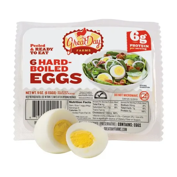 Details Ingredients Eggs, Water, and Citric Acid. Product features Conveniently packaged hard boiled eggs are peeled and ready to eat, making for a quick, protein rich snack or easy meal prep. Great Day Farms Hard Boiled Eggs: Good source of quality protein Convenient Ready to eat Net Quantity of Content 6 X 44 g