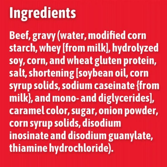 Details Ingredients BEEF, GRAVY (WATER, MODIFIED CORN STARCH, WHEY [FROM MILK], HYDROLYZED SOY, CORN, AND WHEAT GLUTEN PROTEIN, SALT, SHORTENING [PARTIALLY HYDROGENATED SOYBEAN OIL, CORN SYRUP SOLIDS, SODIUM CASEINATE {FROM MILK}, AND MONO-AND DIGLYCERIDES], CARAMEL COLOR, SUGAR, ONION POWDER, CORN SYRUP SOLIDS, DISODIUM INOSINATE AND DISODIUM GUANYLATE, THIAMINE HYDROCHLORIDE). Show more Product features HORMEL Slow Simmered Beef Tips & Gravy is a modern take on a classic dish. Deep, rich gravy smothered beef tips make an easy dish look as if it was slow cooked for hours. Bring the family together with this Southern specialty, paired with a side of vegetables or any other family favorites. Use the extra time this six-minute dish saves to spend with family. Get more family time by adding HORMEL Slow Simmered Beef Tips & Gravy to the meal rotation. HORMEL is a trademark of Hormel Foods, LLC. SOUTHERN STYLE: HORMEL Slow Simmered Beef Tips & Gravy brings hearty, full-bodied, southern charm back to the dinner table with no preservatives QUICK FIX – Six minutes is all that is required to add a delicious protein centerpiece to a planned or impromptu family meal all will love and enjoy HASSLE FREE: Stop worrying about getting dinner ready for a hungry family with the trusted, known taste of this six-minute, worry-free, dinner fix ROBUST FLAVOR: Hearty, wholesome beef tips smothered in thick gravy instantly creates a dish with the homestyle flavors you love VERSATILE– This entrée dish can be served with an assortment of vegetables, over egg noodles, or wrapped in tortillas Special Features Ready in 4 minutes Net Quantity of Content ABOUT 3.5 X 0.5 cup