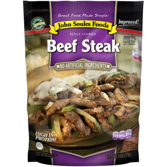 Details Ingredients Beef, water, seasoning (potato starch, vinegar, yeast extract, sea salt, spice, natural flavor [extract of rosemary], citrus extract), beef base (roasted beef sirloin and beef stock, salt, sugar, corn starch, dried potato, beef fat, natural flavors, high oleic sunflower oil, onion powder, garlic powder). Gluten free Show more Product features Beef Steak takes you from "What’s for dinner?!" to "Dinner’s ready!" in about 10 minutes. The delicate spices have a versatility that ranges from Philly Cheese Steak to Asian Stir Fry. Sliced oh-so-thinly, the beef cooks in a flash. How about steak salad with blue cheese? Now we are talking! Fully cooked and refrigerated Thinly sliced and seasoned beef strips All natural with no artificial ingredients Gluten free High in protein Fresh for 5 days after opening Net Quantity of Content 2 X 3 oz