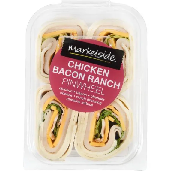 Details Ingredients Made with chicken, bacon, cheddar cheese, ranch dressing and romaine lettuce. Product features Marketside Chicken Bacon Ranch Pinwheels are stuffed with a delicious combination of chicken, bacon, cheddar cheese, ranch dressing and romaine lettuce. These ready-to-eat mini wraps are perfect for a quick and easy lunch while studying in the library, working at your desk or traveling on the go. Make it an extra filling meal and enjoy with a cup of your favorite soup and a side of chips. They come packaged in a reclosable container, keeping your pinwheels fresh after every snack. Enjoy a gourmet lunch that is prepared just for you with Marketside Chicken Bacon Ranch Pinwheels. Fresh ideas and quality ingredients, that's how Marketside brings the best foods to your table. We are committed to deliver freshness that you can taste and see. Marketside offers the best in fresh food, guaranteed by Walmart, working in partnership with farmers, bakers and chefs for the highest quality, authentic ingredients and favorite recipes. Marketside Chicken Bacon Ranch Pinwheel, 4 Count: Made with chicken, bacon, cheddar cheese, ranch dressing and romaine lettuce Perfect for parties Quick and easy lunch option Includes 4 pinwheels Allergy Notice Our stores may use some of the following ingredients: peanuts, eggs, soy, tree nuts, wheat, dairy products, fish, and/or shellfish. Even if these are not listed on the ingredient label, please be aware that all products may have come in contact with these ingredients.