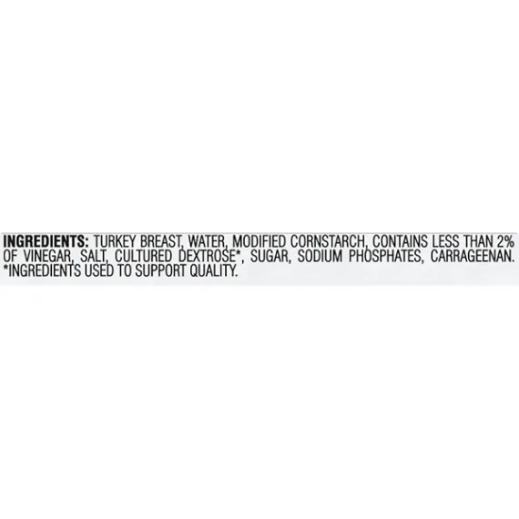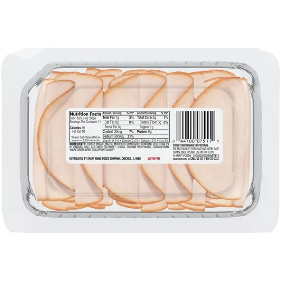 Details Ingredients Turkey Breast, Water, Modified Cornstarch, Contains Less Than 2% Of Vinegar, Salt, Cultured Dextrose*, Sugar, Sodium Phosphates, Carrageenan. *Ingredients Used To Support Quality. Show more Product features Oscar Mayer Deli Fresh Smoked Turkey Breast is quality turkey deli meat with no artificial preservatives, no nitrates or nitrites added, and no added hormones. So you can enjoy the fresh taste you want with nothing you don't! This turkey lunch meat is fully cooked, and it has a mouthwatering smoky flavor perfect for a classic turkey sandwich. Oscar Mayer Deli Fresh makes the perfect lunch - use slices of smoked turkey to make a turkey and cheese sandwich, or try making a turkey melt in the oven. Oscar Mayer Deli Fresh turkey breast also makes a great addition to cheese and crackers or a Cobb salad. Keep the 22 ounce package refrigerated to maintain freshness. One 22 oz. tray of Oscar Mayer Deli Fresh Smoked Turkey Breast No artificial preservatives, see back panel for ingredients to support quality No nitrates or nitrites added Turkey raised with no added hormones Fully cooked and ready to eat Add a few slices of turkey lunch meat to sandwiches, cheese and crackers or salads Keep packaged meat refrigerated to maximize freshness Special Features Fully Cooked Net Quantity of Content 11.0 X 2 oz (56g)