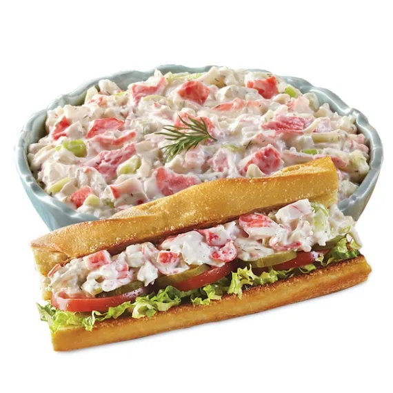 Details Ingredients Imitation Crab Meat (Water, Fish Protein [Alaska Pollock, And/Or Pacific Whiting] Potato Starch, Sorbitol, Wheat Starch, Sugar, Wheat Flour, Salt, Sweetened Rice Wine [Corn Syrup, Fermented Rice Extract, Water, Salt], Soybean Oil, Natural And Artificial Flavors [Hydrolyzed Soy Protein, Crab Extract], Egg Whites, Soy Lecithin, Sodium Tripolyphosphate, Tetrasodium Pyrophosphate, Color Added [Carmine, Paprika, Canthaxanthin, Titanium Dioxide]), Mayonnaise Style Dressing (Soybean Oil, Water, High Fructose Corn Syrup, Distilled And Cider Vinegar, Modified Corn Starch, Egg Yolks, Eggs), Celery, Sour Cream (Cultured Cream), Onions, Shrimp (Shrimp, Salt, Natural Flavorings, Color Added FD&C Red 40), Water, Less Than 2%: Dried Dill, Vinegar, Citric Acid, Sodium Citrate, Lemon Juice Concentrate, Salt, Natural Flavors, Gums (Xanthan, Guar, Locust Bean), Sugar, Corn Syrup, Spices, Paprika, Calcium Disodium EDTA (To Protect Flavor), Whey, Modified Corn Starch, Gelatin (Beef), Sodium Tripolyphophate, Carrageenan, Calcium Sulfate, Sodium Benzoate And Potassium Sorbate (Added To Protect Freshness). Show more Product features WHOLESOME, HEARTY AND DELICIOUS SEAFOOD SALAD MADE WITH WILD CAUGHT ALASKA POLLOCK AND SALAD SHRIMP FROM THE PACIFIC OCEAN BLENDED WITH MAYONNAISE AND SOUR CREAM, CRISP CELERY AND A HINT OF DILL. Contains 32 mg of EPA and DHA combined per serving, which is 20% of the 160mg daily value for a combination of EPA and DHA. Excellent source of Omega 3 EPA and DHA MADE WITH REAL MAYONNAISE 0g TRANS FAT Made in USA Special Features With dill Net Quantity of Content 4.0 X 0.5 cup