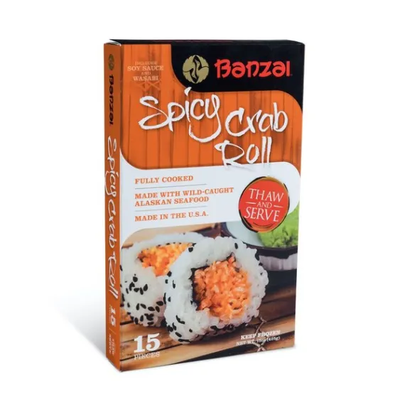 Details Ingredients SUSHI INGREDIENT: RICE, SURIMI (ALASKA PLOCK, WATER, SUGAR, EGG WHITES, WHEAT STARCH, CORN STARCH, CONTAINS 2% OR LESS OF THE FOLLOWING: SOYBEAN OIL, SORBITOL, MODIFIED FOOD STARCH, MIRIN WINE (SAKE, SUGAR, SALT, WATER YEAST EXTRACT), SALT, POTASSIUM CHLORIDE, ARTIFICIAL CRAB FLAVOR, CARRAGEENAN, SODIUM TRIPOLYPHOSPHATE, TETRASODIUM PYROPHOSPHATE, CITRIC ACID, PAPRIKA OLEORESIN, CARMINE, SOY LECITHIN, COLOR ADDED), CARROTS, VEGETABLE OIL, EGG, CHILI SAUCE (WATER, CHILI, SUGAR, GARLIC, SALT, VINEGAR), SUGAR, VINEGAR, SEAWEED, SALT SESAME SEED. Show more Product features Enjoy sushi from the comfort of your home with Banzai Spicy Crab Rolls. This roll has imitation crab and carrots wrapped in rice with a secret spice. This sushi is fully cooked, you just need to simply thaw, serve, and enjoy. The sushi is low in fat, low in calories, and high in proteins and vitamins, so you can have peace of mind of when enjoy these delicious sushi rolls. Each box contains 15 pieces and includes soy sauce and wasabi, you have everything you need to indulge in a complete sushi meal. Pick up Banzai Shrimp and Avocado Sushi Rolls today for convenient Japanese style meal. Banzai Sushi was founded with the idea of healthier foods into schools. Our sushi is recognized for the Japanese craftsmanship and freshness enhancing freezing techniques we put into each bite: We want you to feel good about eating our product; all of our seafood is wild caught in the waters of the Pacific Northwest and we use authentic Japanese sushi rice grown in the sunny valleys of California. Please enjoy - Banzai! Banzai Spicy Crab Sushi Roll, 15 Pieces, 15 oz: Imitation crab and carrots wrapped in rice with a secret spice Low in fat, calories, and high in proteins and vitamins Includes soy sauce and wasabi Fully cooked, simply thaw, serve, and enjoy Keep frozen Net Quantity of Content 3 PIECES X 142 g
